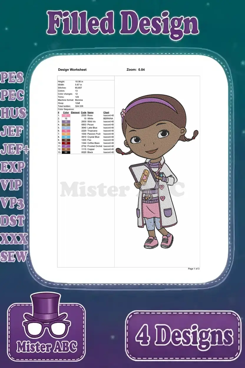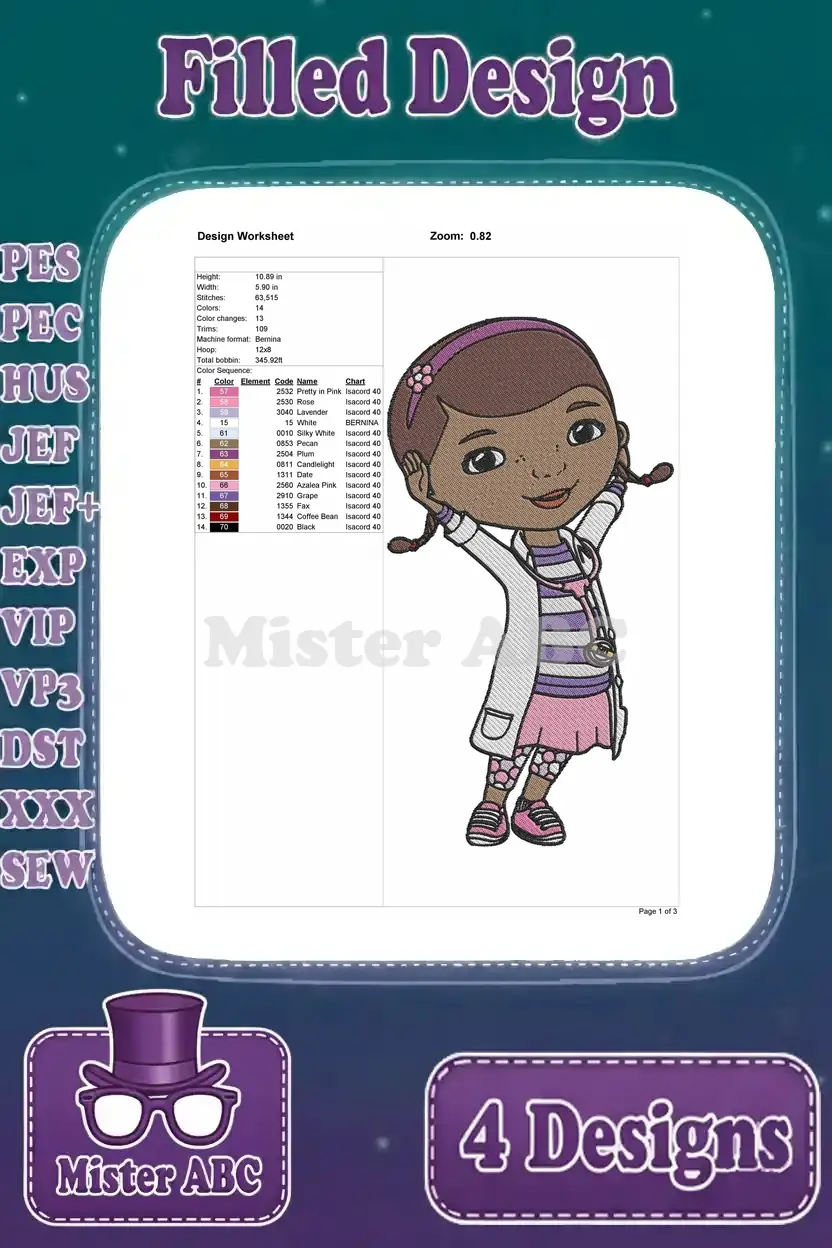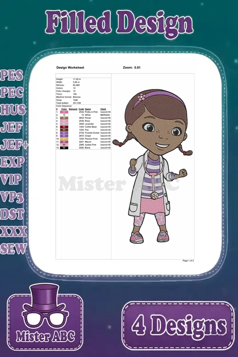 Doc Mcstuffins – Dottie The Toy Doctor – Professional Doctor Poses – Illustration Pack – Filled Embroidery Design