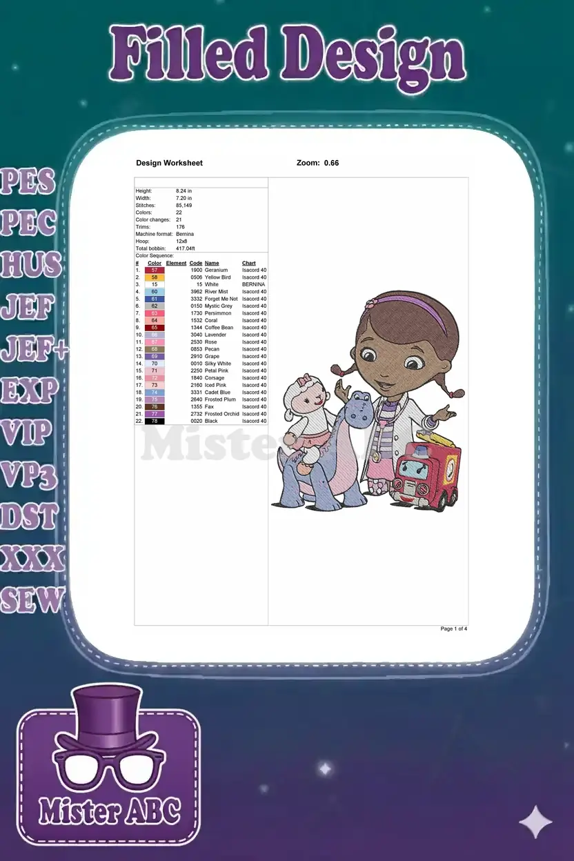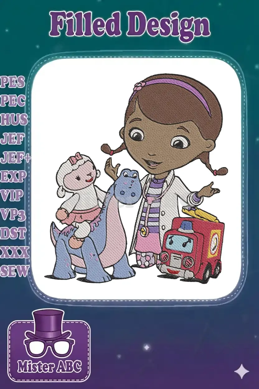 Bring the magic of Doc McStuffins and her adorable friends to life with this vibrant, detailed embroidery design!