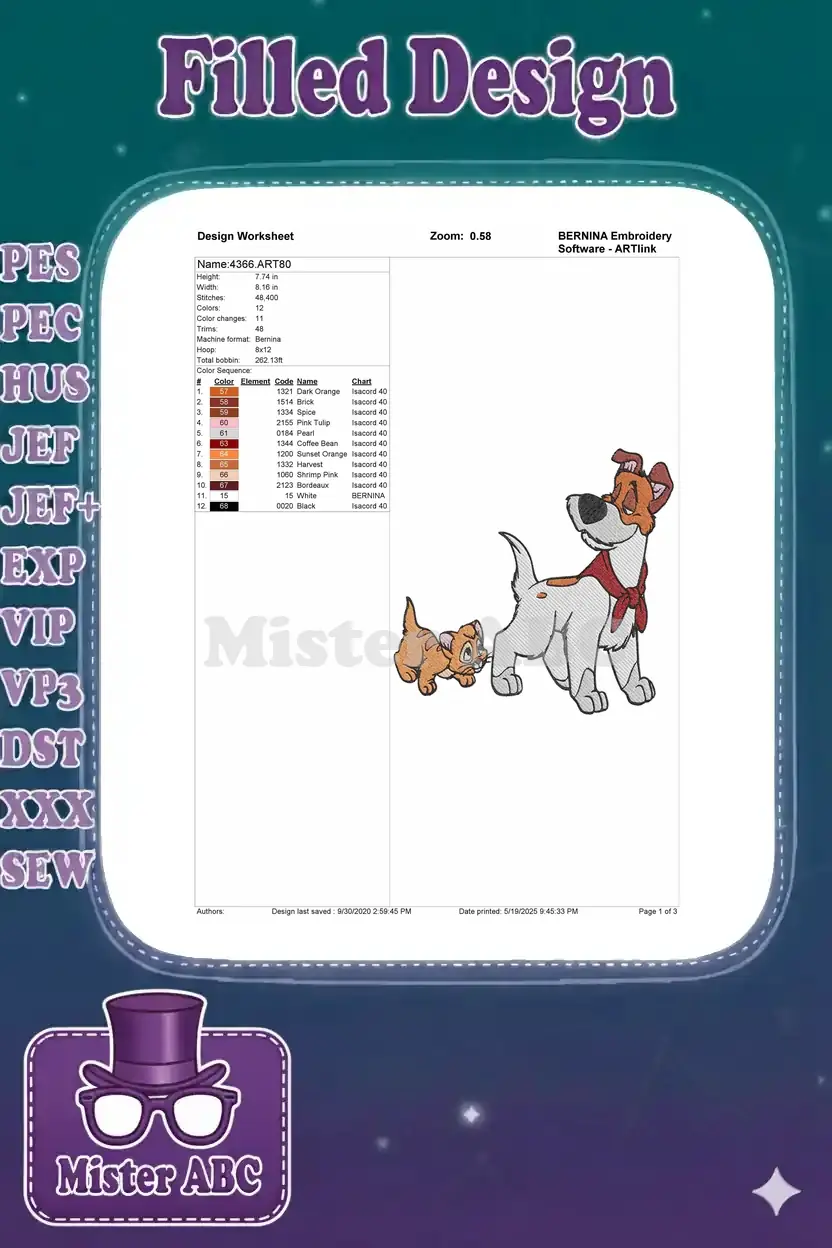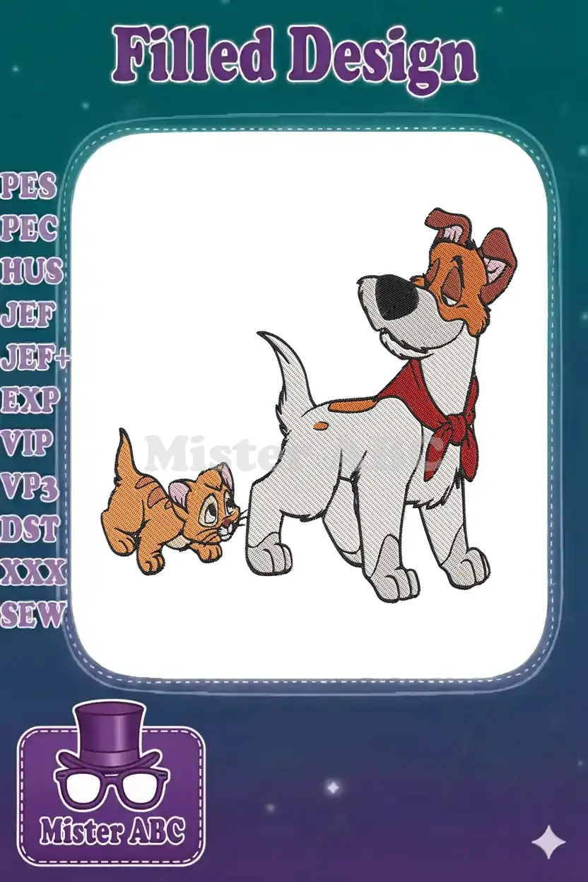 Dodger and Oliver cartoon dog cat friendship embroidery designs