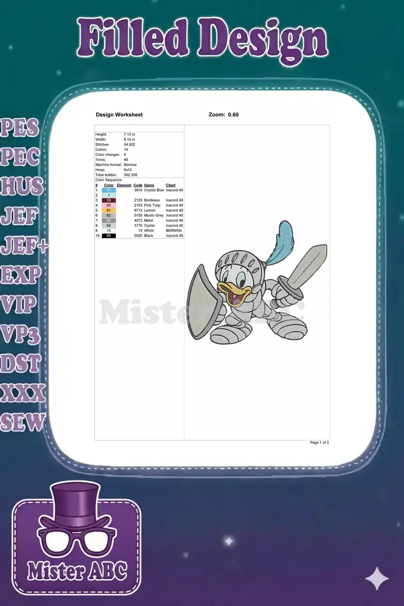 Donald Duck Knight with Sword Shield Character Embroidery Designs