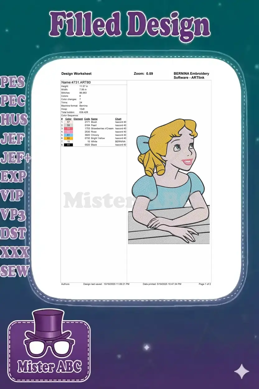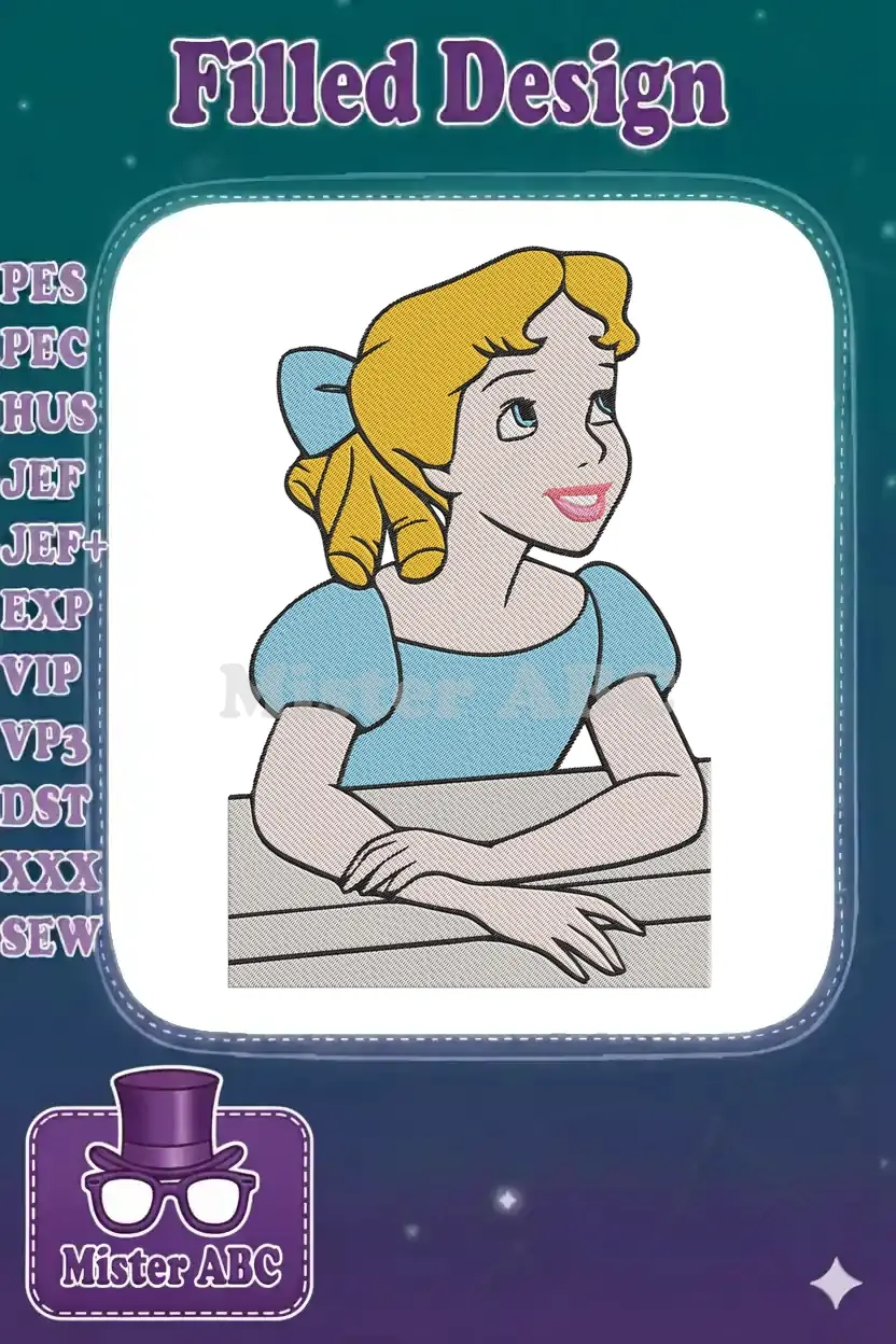 Dreamy blonde girl blue dress fairytale character embroidery designs