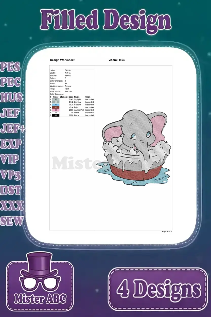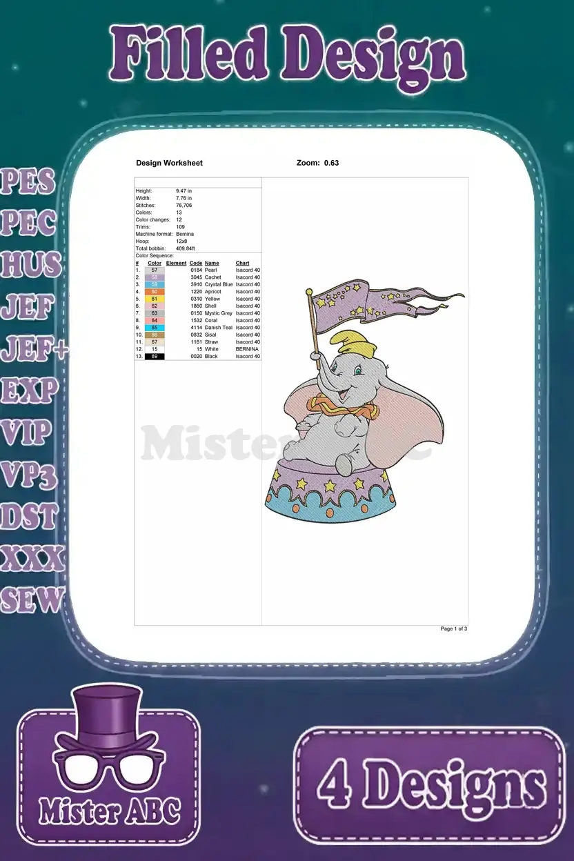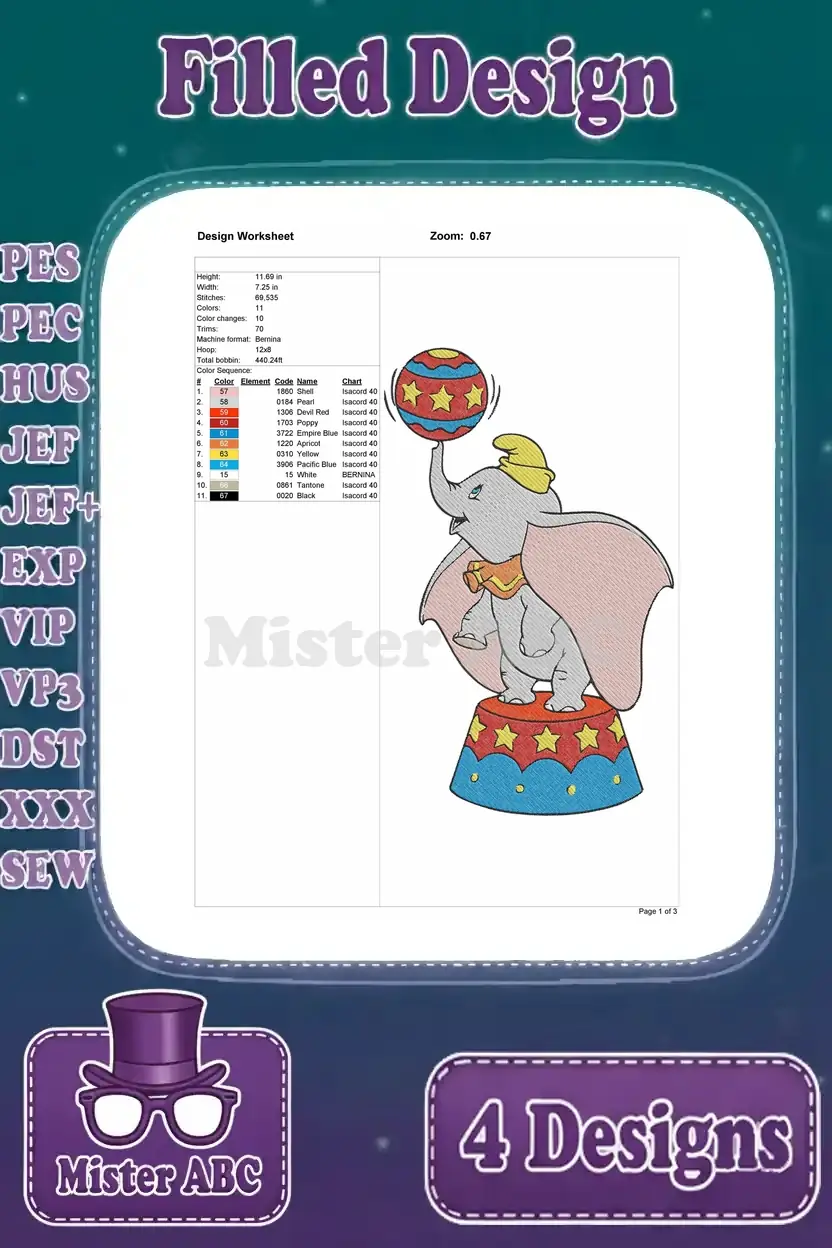Dumbo Baby Elephant Circus Acts Balancing Ball Bath Tub On Cake Flag – Filled Embroidery Design