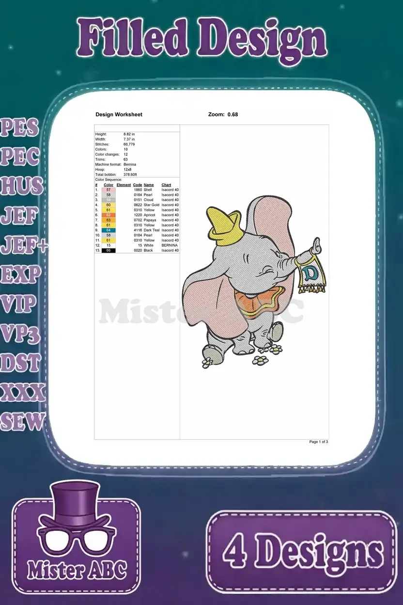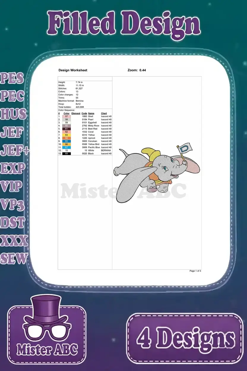 Dumbo Baby Elephant Flying With Magic Feather And Timothy Mouse Flag Carrier – Filled Embroidery Design