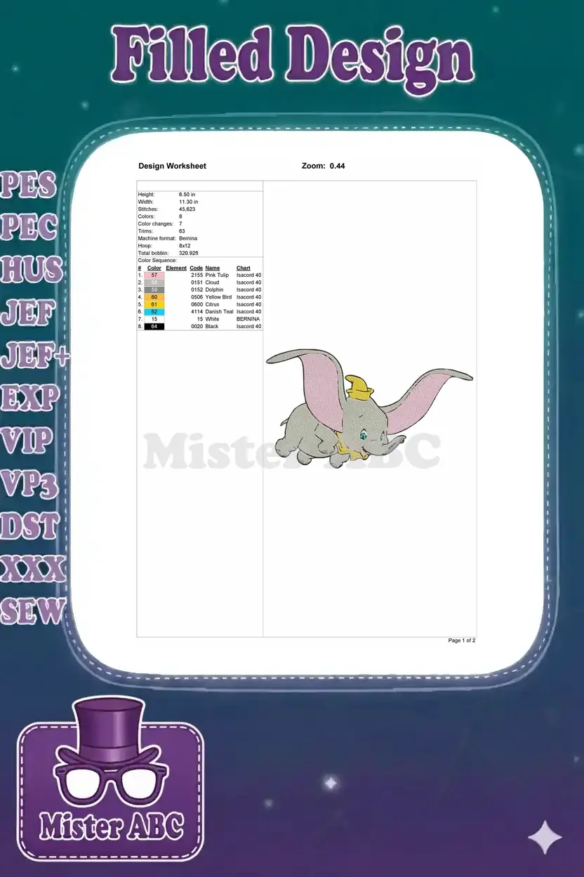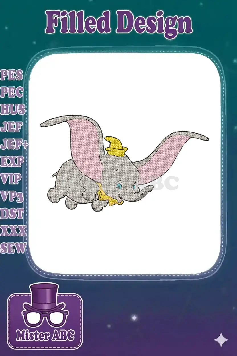 Dumbo Flying Elephant with Yellow Hat and Collar Embroidery Designs