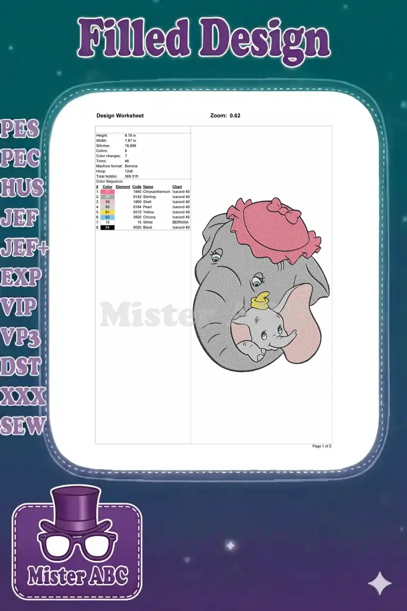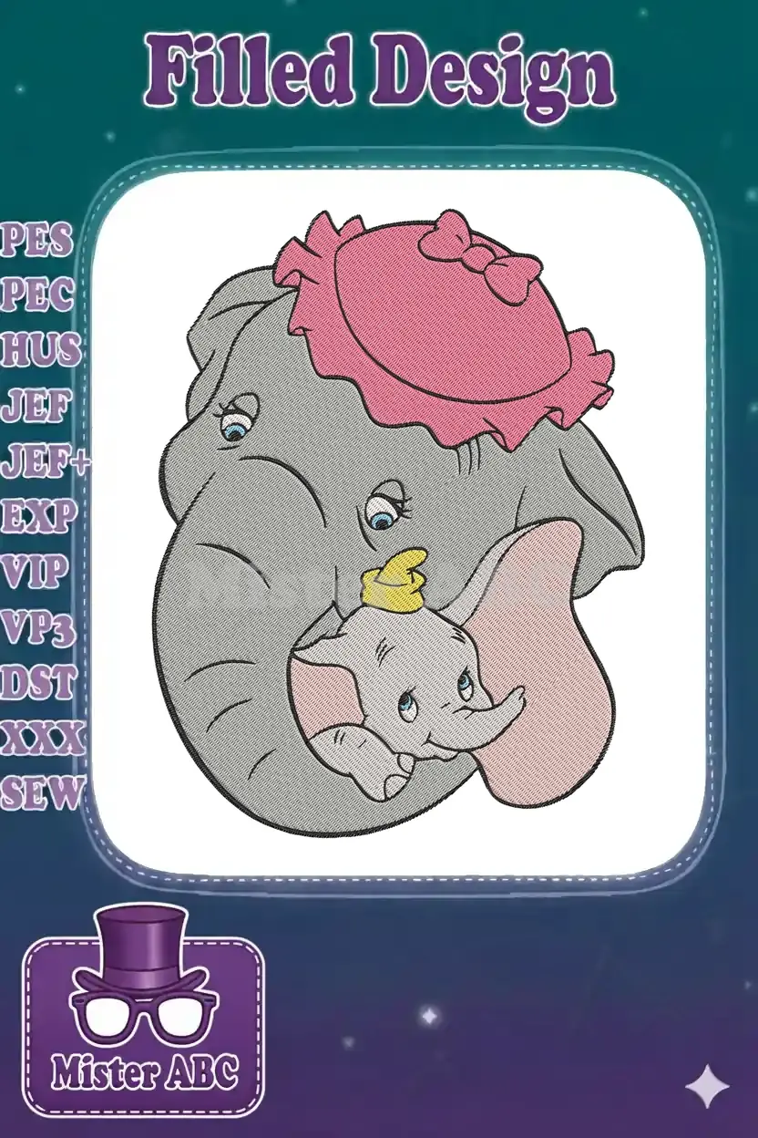Adorable Dumbo and Mrs. Jumbo embroidery design, perfect for fans. Captures a heartwarming embrace with detailed stitching.