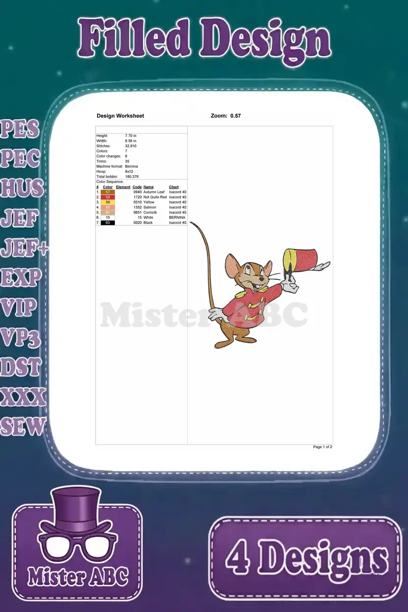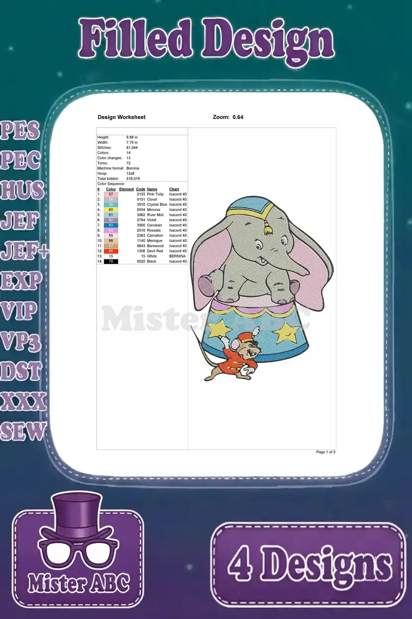 Dumbo Timothy Mouse Mail Dumbo Baby Elephant Clown Costume Poses – Filled Embroidery Design