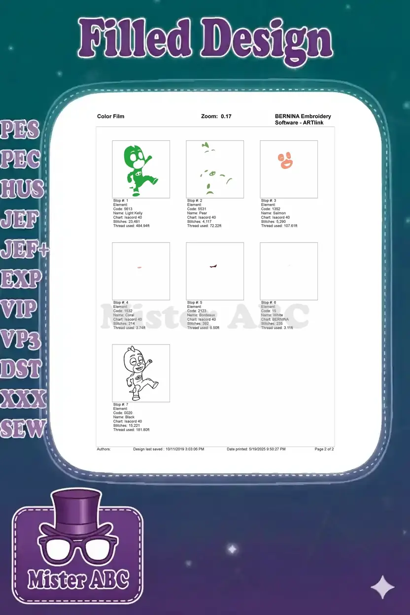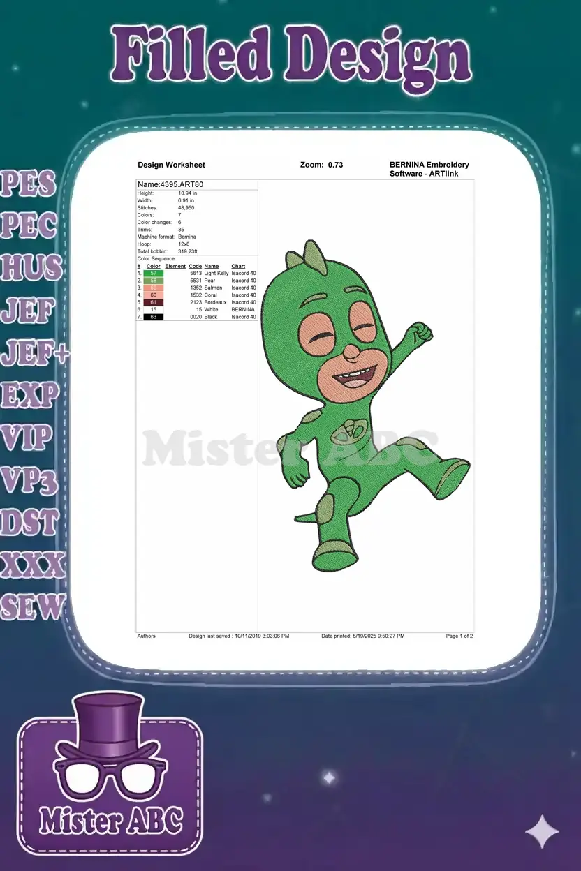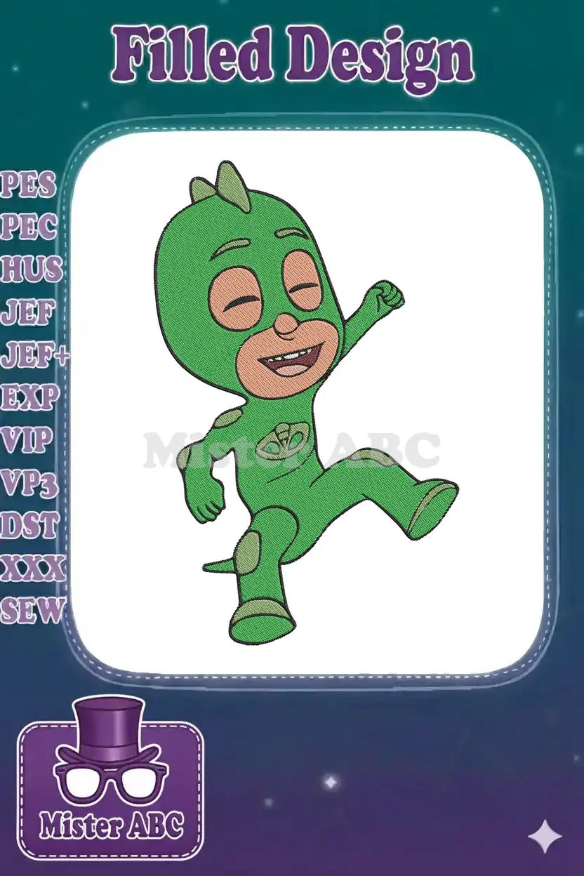 Dynamic Gekko PJ Masks Superhero Cartoon Character Embroidery Designs