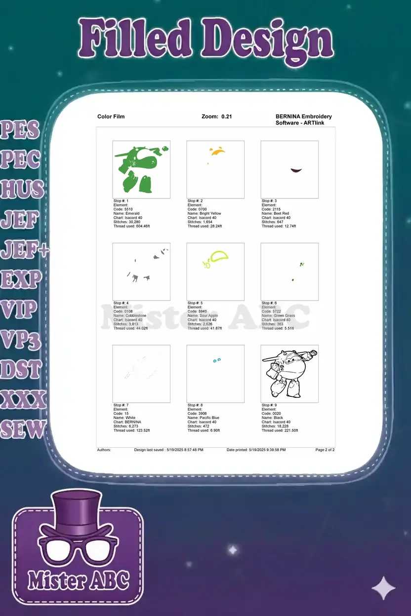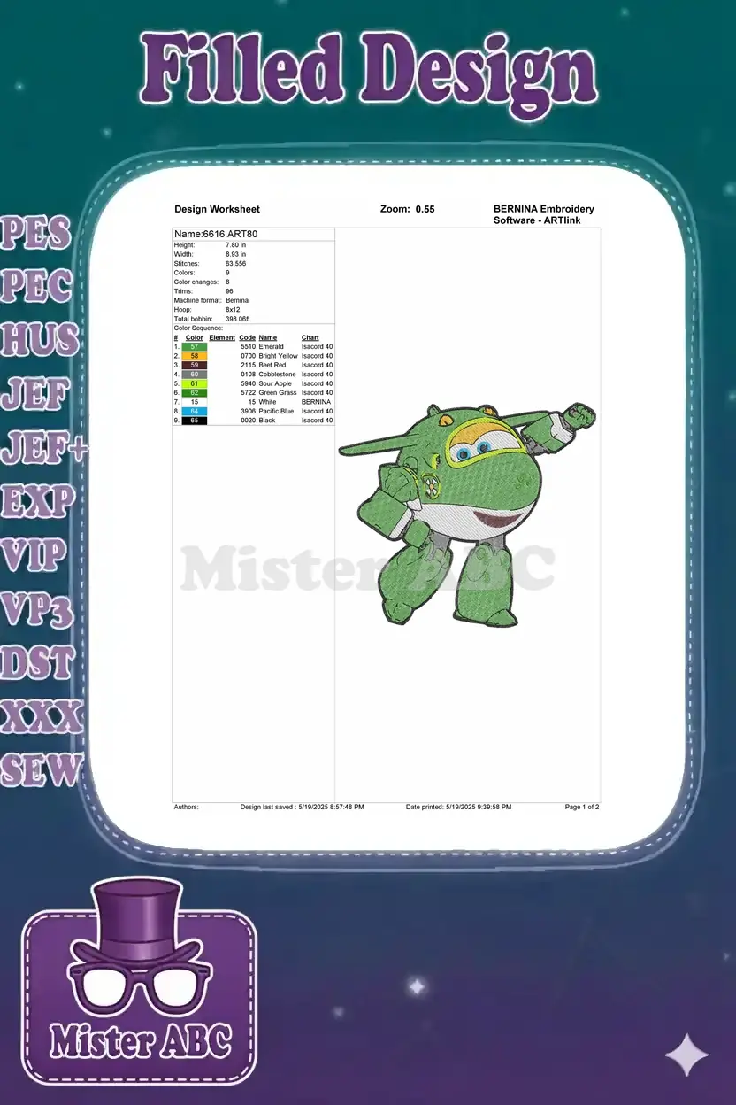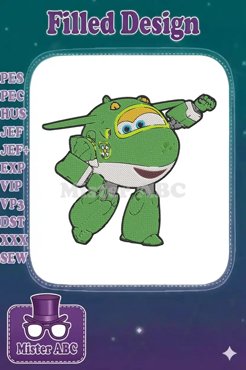 Dynamic Green Cartoon Plane Robot Character Embroidery Designs