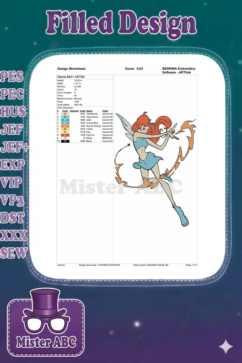 Dynamic red-haired fairy casting fire spell embroidery designs