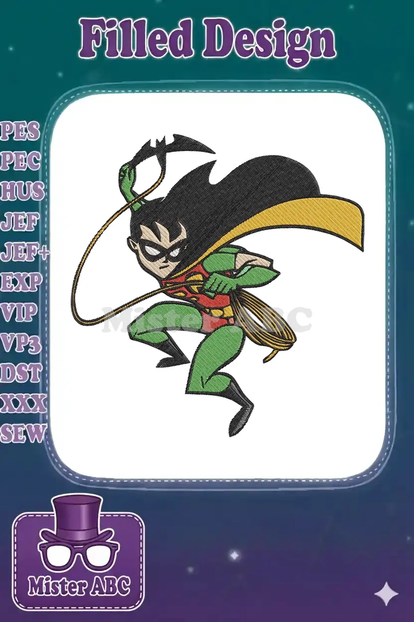 Unleash your inner hero with this dynamic embroidery of Robin the Boy Wonder in an action pose. Perfect for fans!