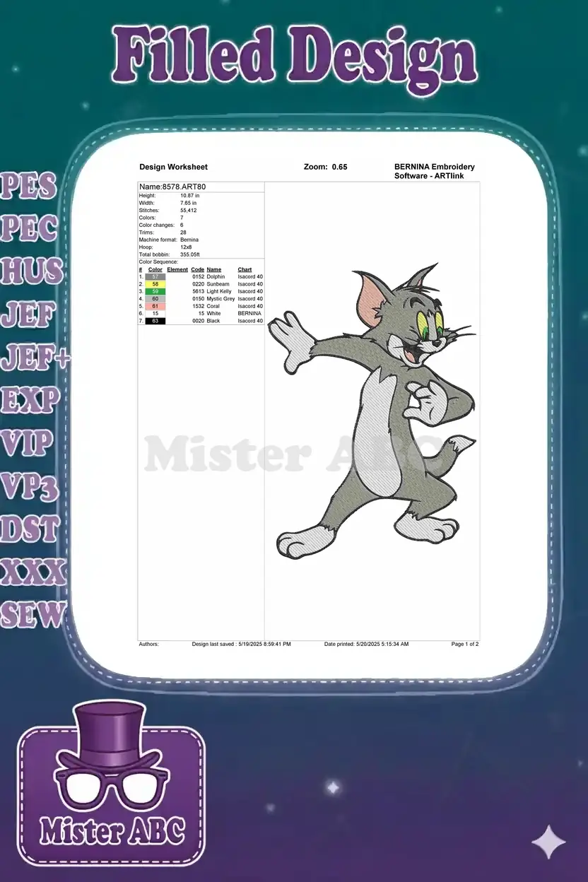 Capture the mischievous charm of Tom the cat with this vibrant embroidery design. Perfect for fans and custom projects.