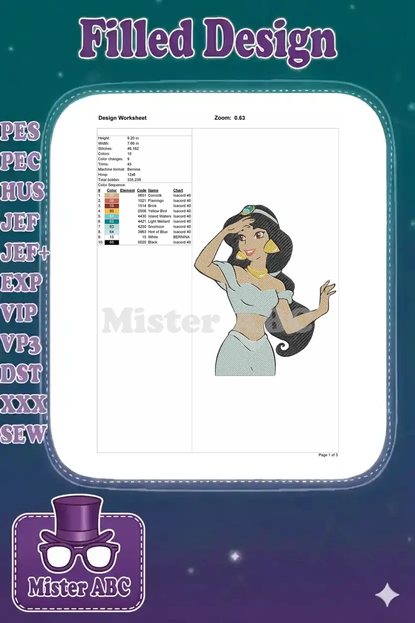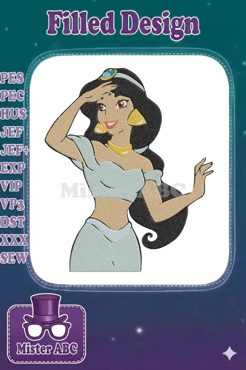 Capture the magic of Agrabah with this vibrant Princess Jasmine embroidery design, perfect for any fan’s project.