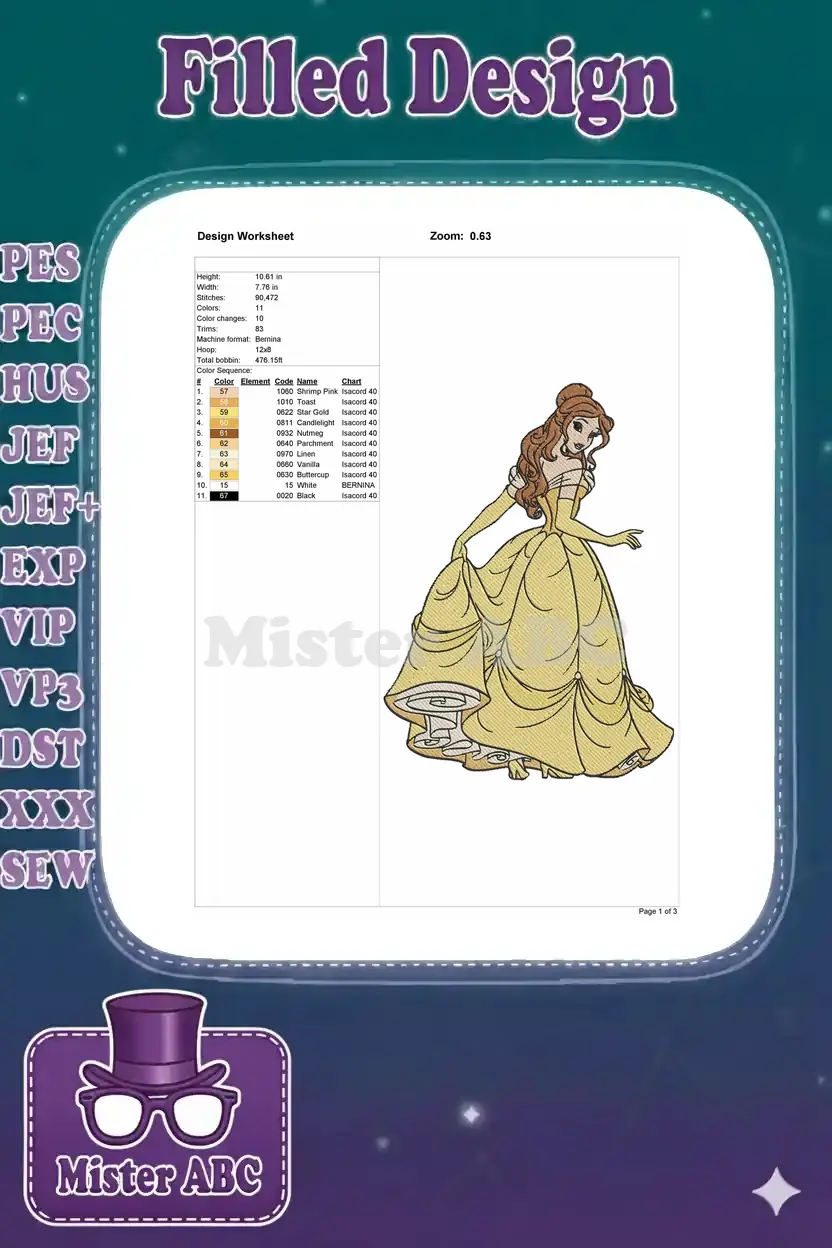 Elegant Belle embroidery design, capturing the iconic Disney princess in her radiant yellow ball gown. Perfect for adding a touch of fairytale magic to any project, celebrating beauty and grace with detailed stitching.