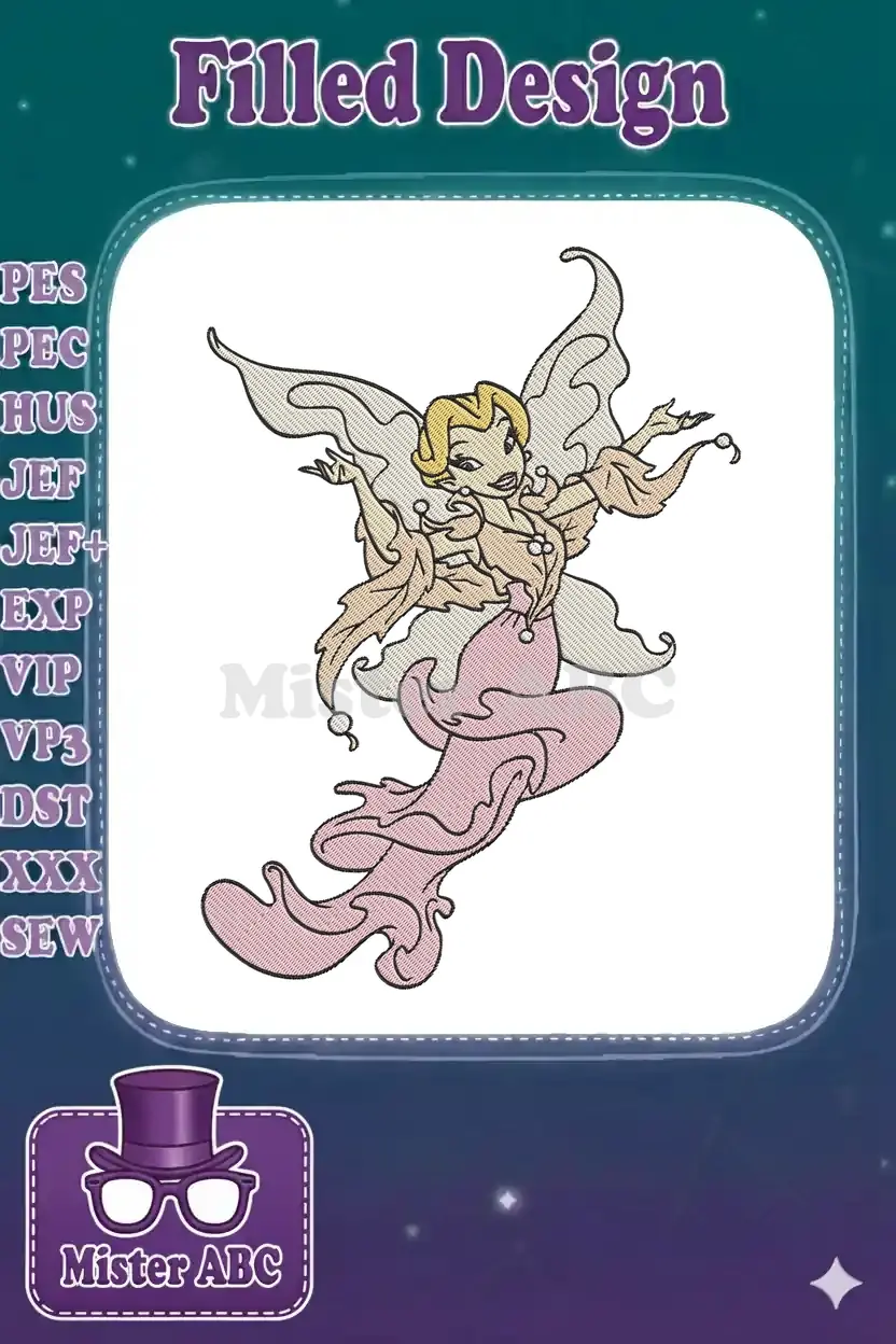 Elegant Blonde Fairy with Pink Tail and Wings Embroidery Designs