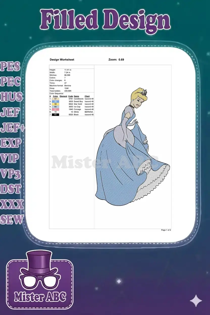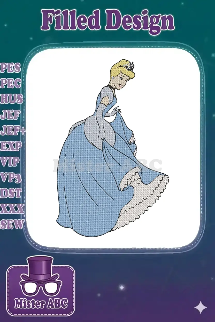 Elegant Cinderella Princess in Blue Ball Gown Embroidery Designs
