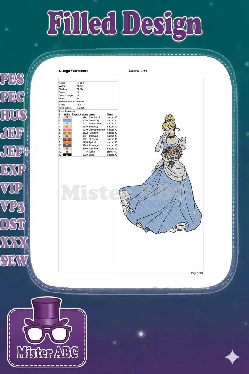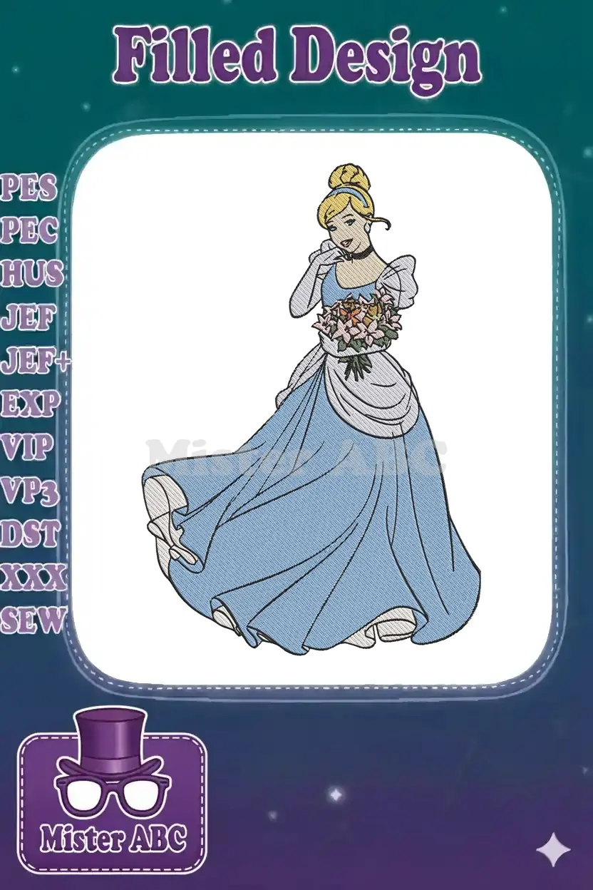 Elegant Cinderella Princess Blue Gown Floral Bouquet Embroidery Designs