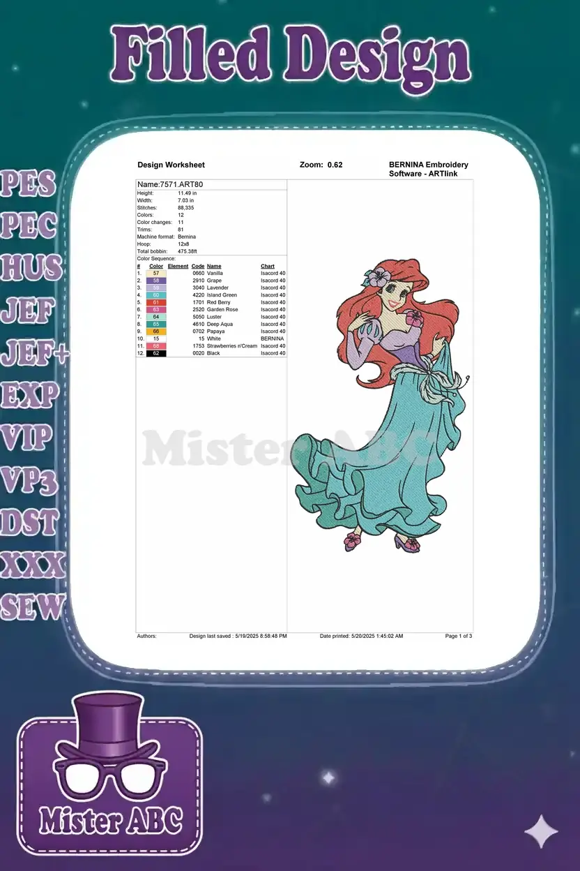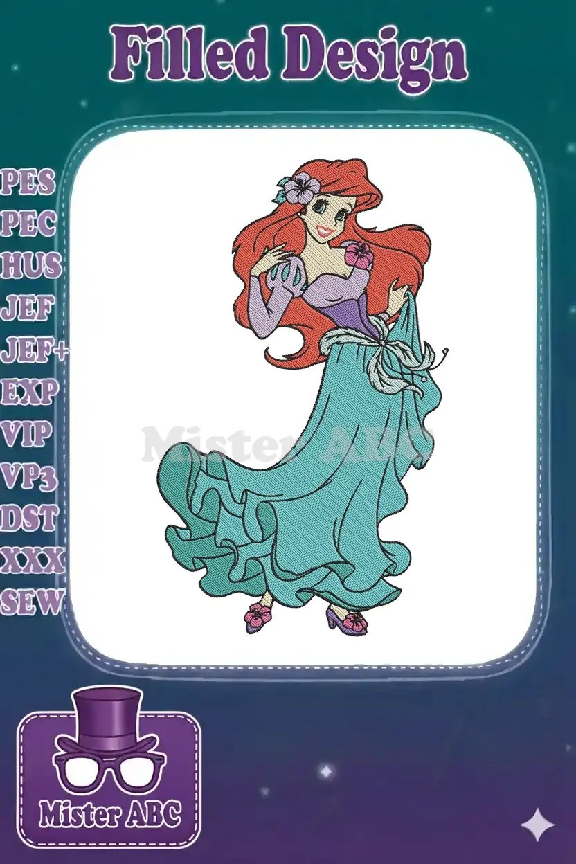 Elegant Disney Princess Ariel red hair flowing dress embroidery designs