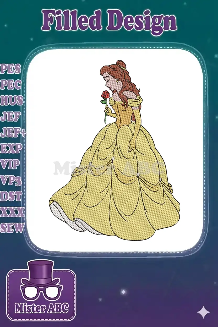 Elegant Disney Princess Belle Yellow Gown Rose Embroidery Designs