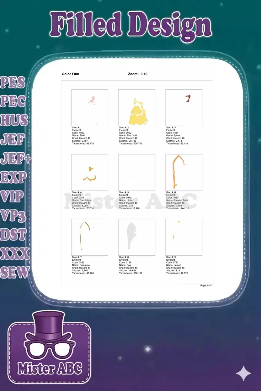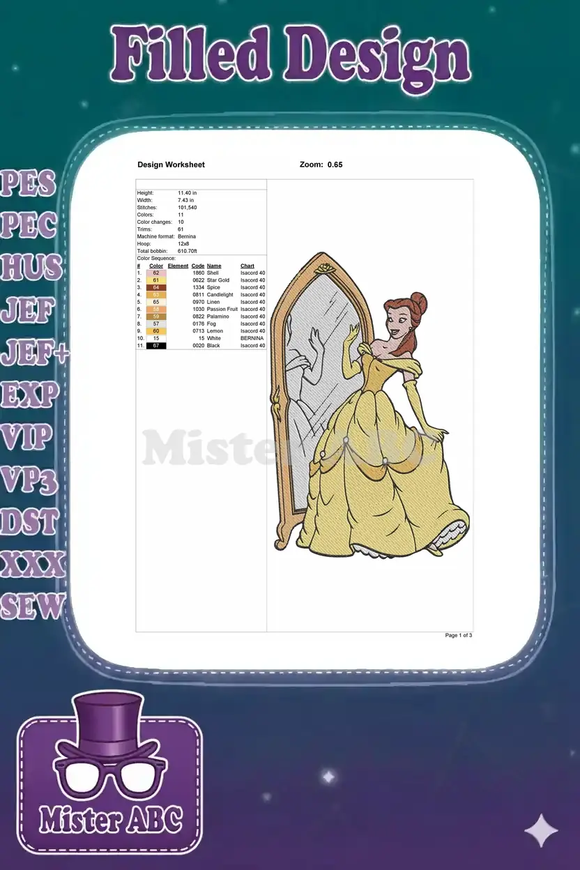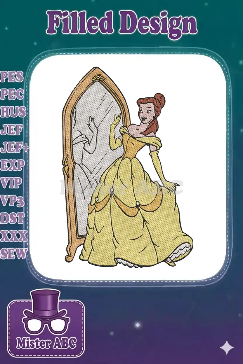 Elegant Princess Belle Yellow Gown Mirror Reflection Embroidery Designs