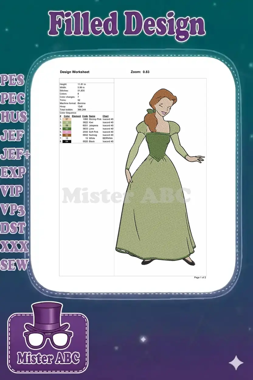 Elegant Princess in Green Gown Fairytale Character embroidery designs