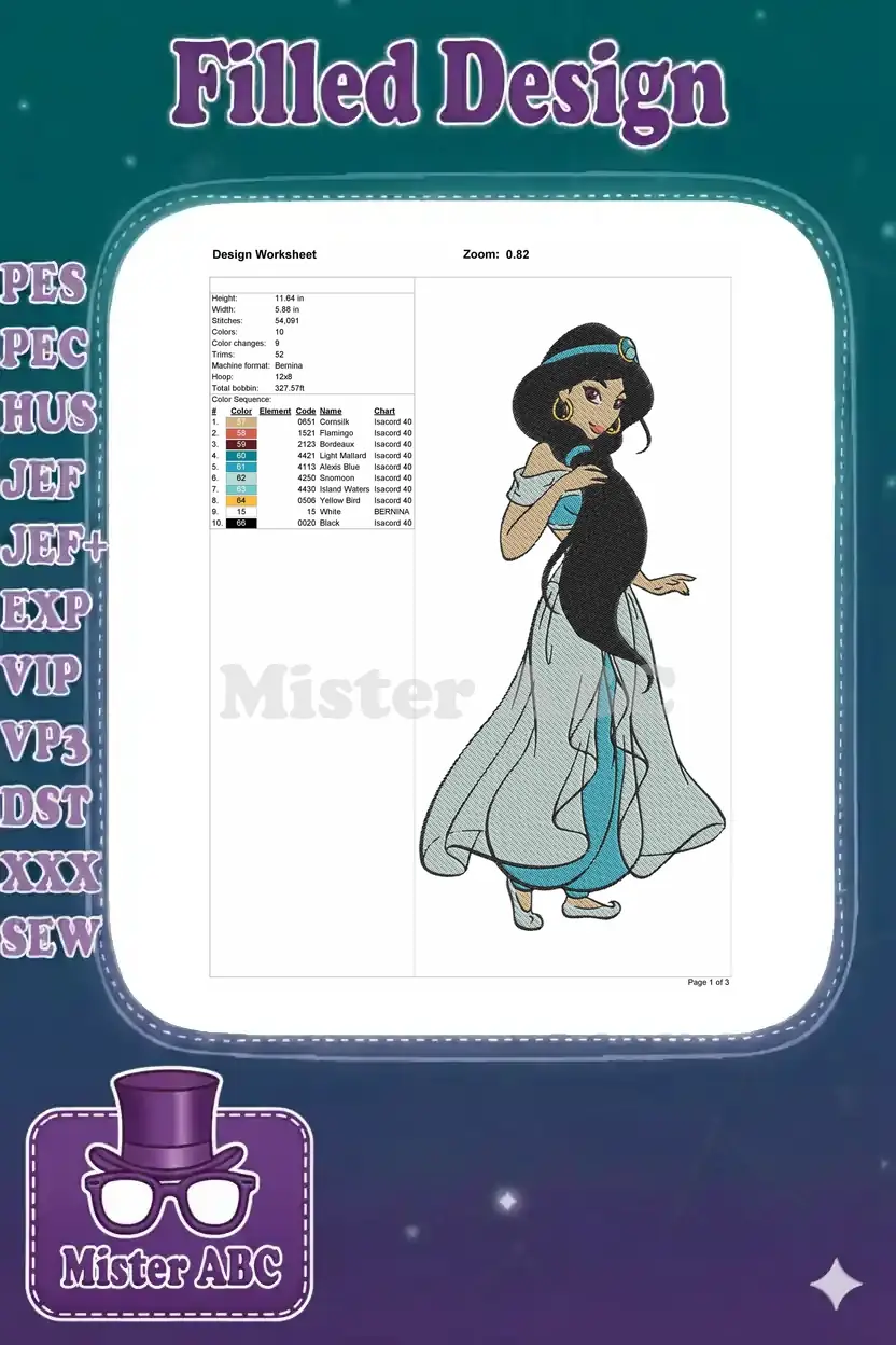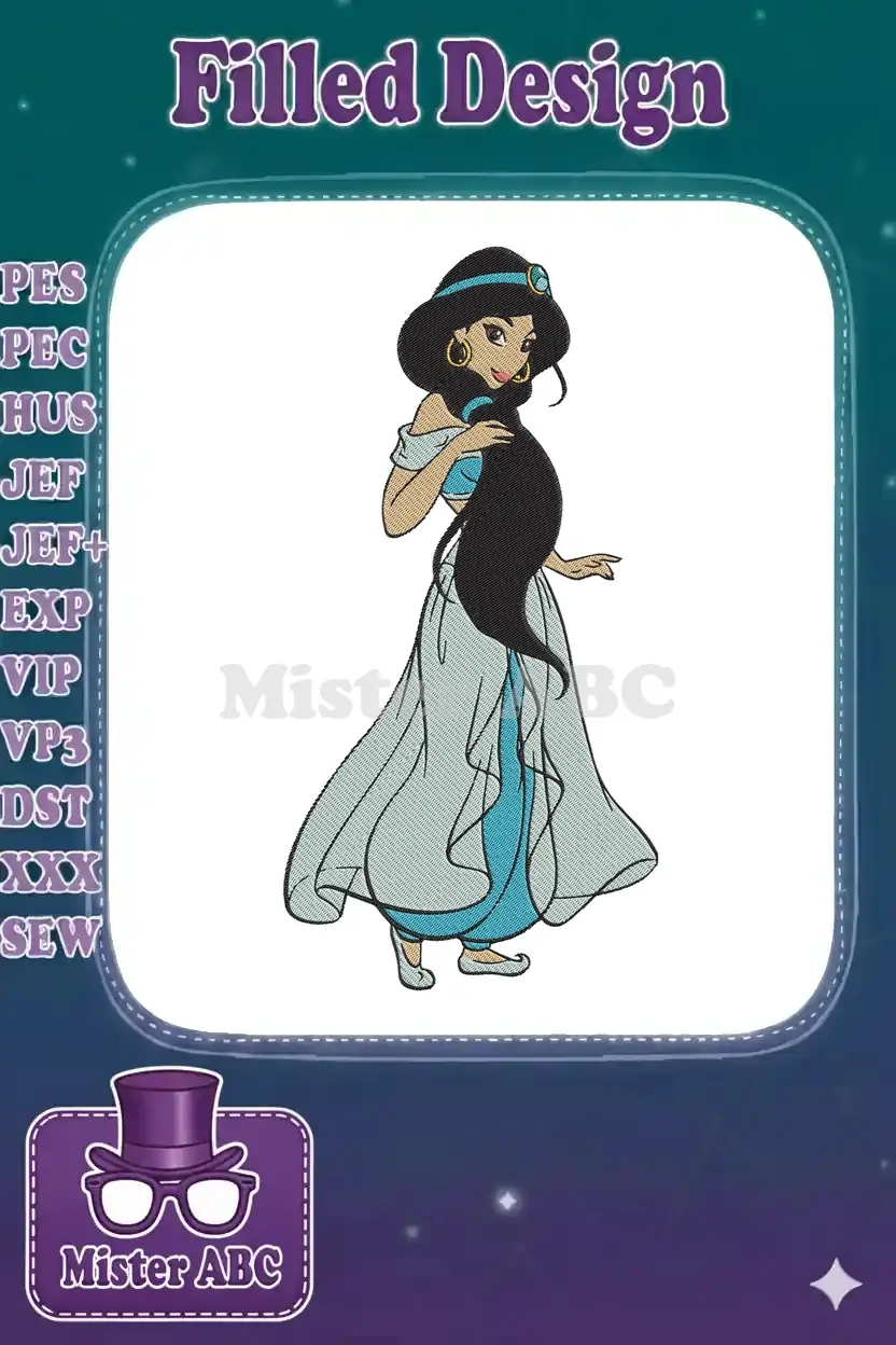 Elegant Princess Jasmine Disney embroidery designs with flowing black hair