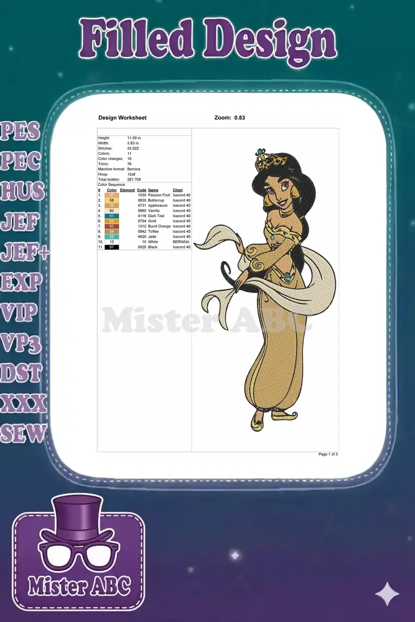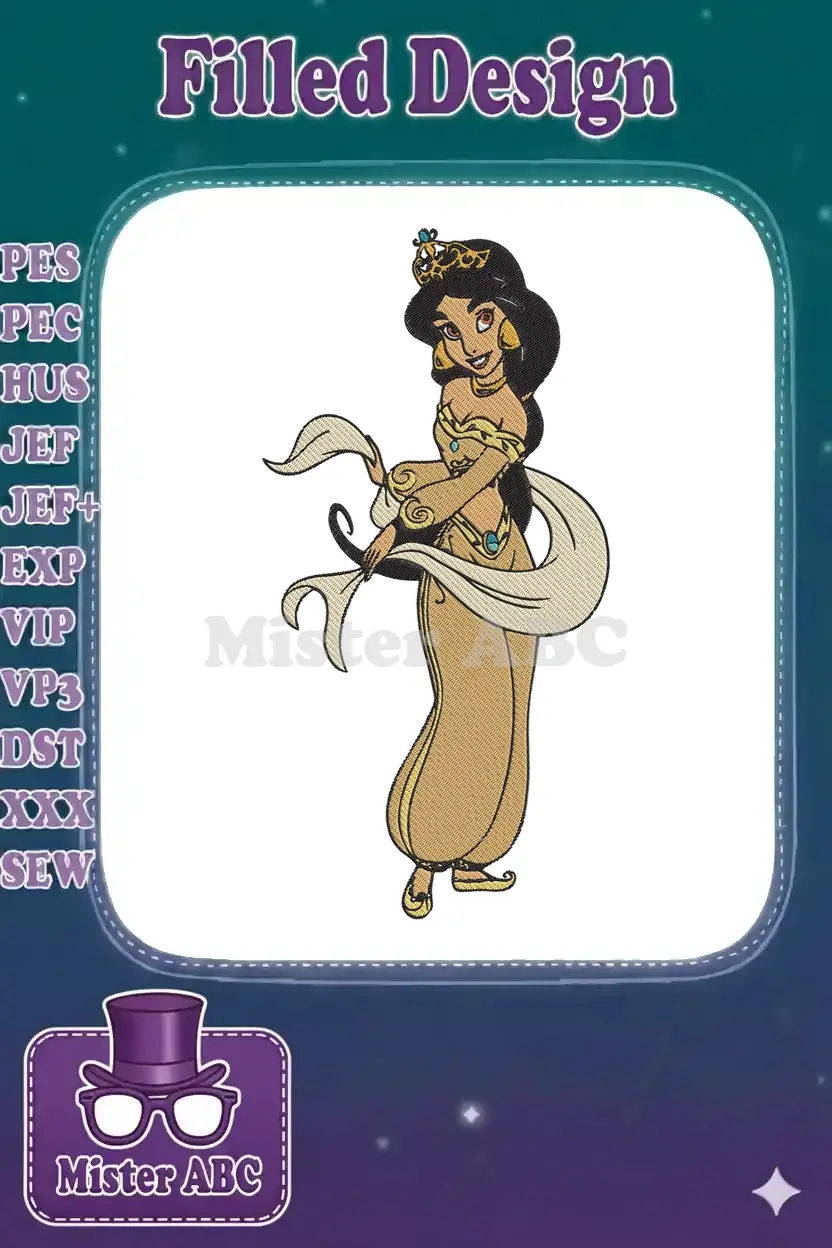 Elegant Princess Jasmine golden outfit tiara embroidery designs with flowing fabric