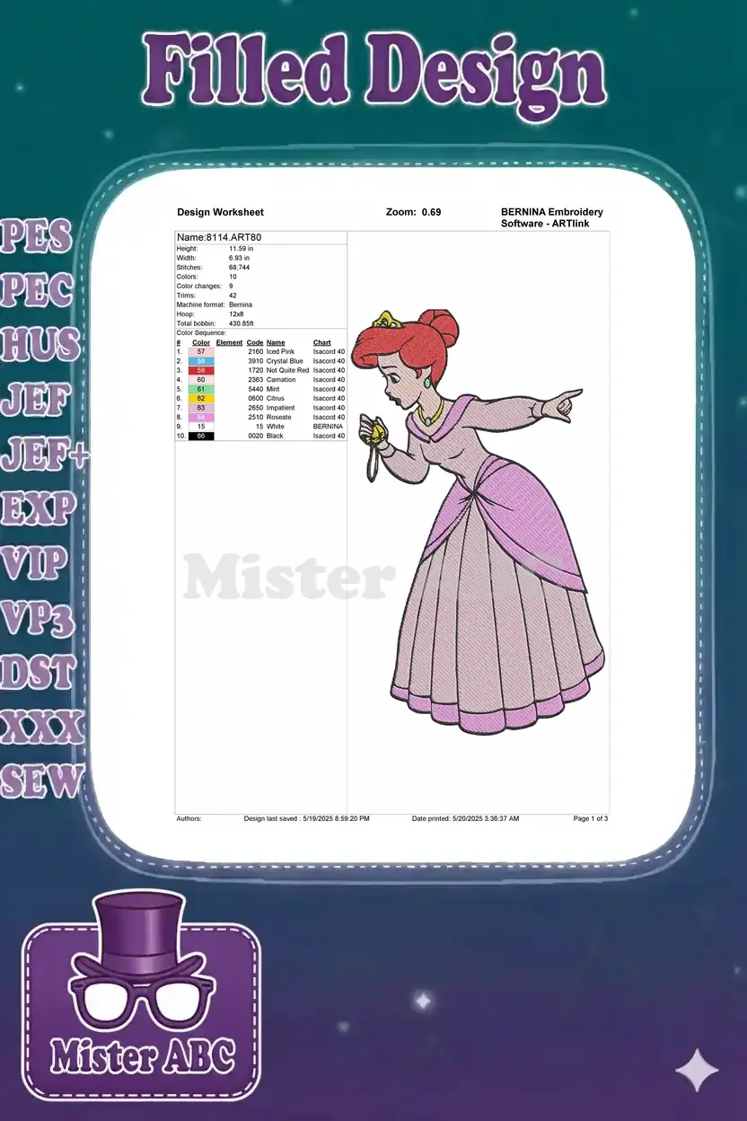 Elegant red-haired princess in pink gown pointing embroidery designs – Instant Download