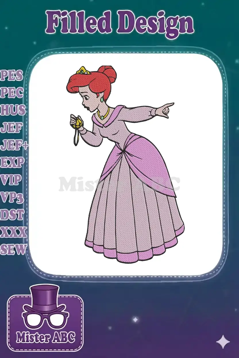 Elegant Ariel embroidery design in her human form, holding a locket and pointing. Perfect for enchanting Disney-themed creations.