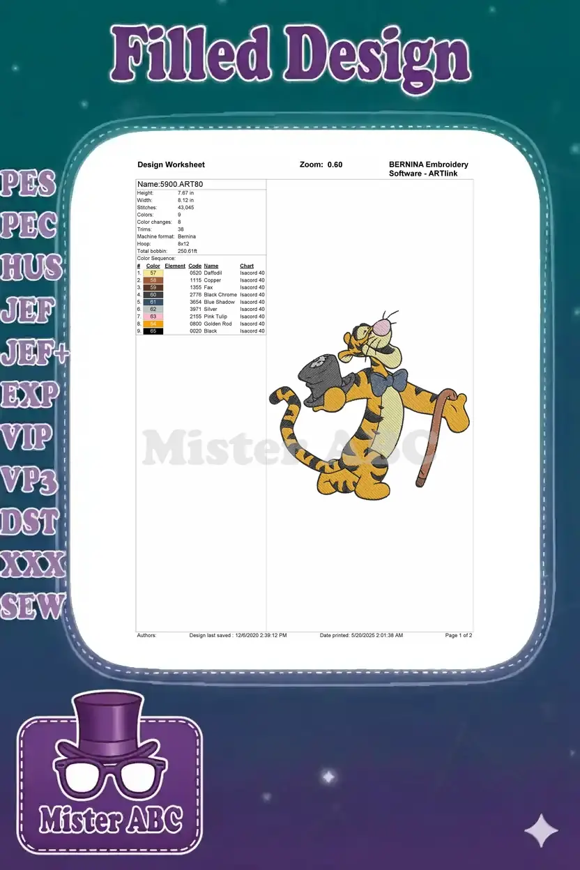 Elegant Tigger Dapper with Top Hat and Cane Embroidery Designs