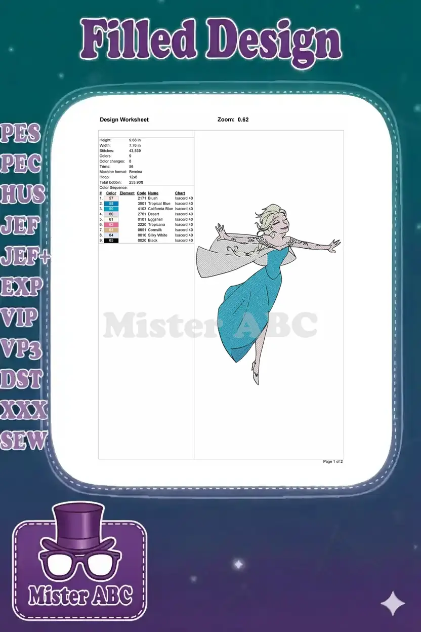 Elsa Frozen Queen elegant blue dress magical flowing embroidery designs