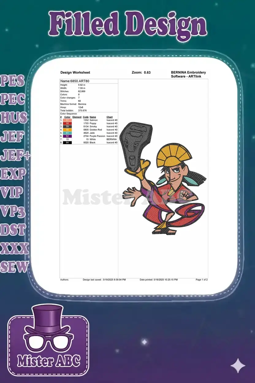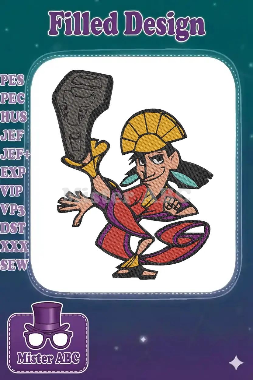 Vibrant Kuzco embroidery design captures the emperor’s iconic pose, bringing animated fun to any project.