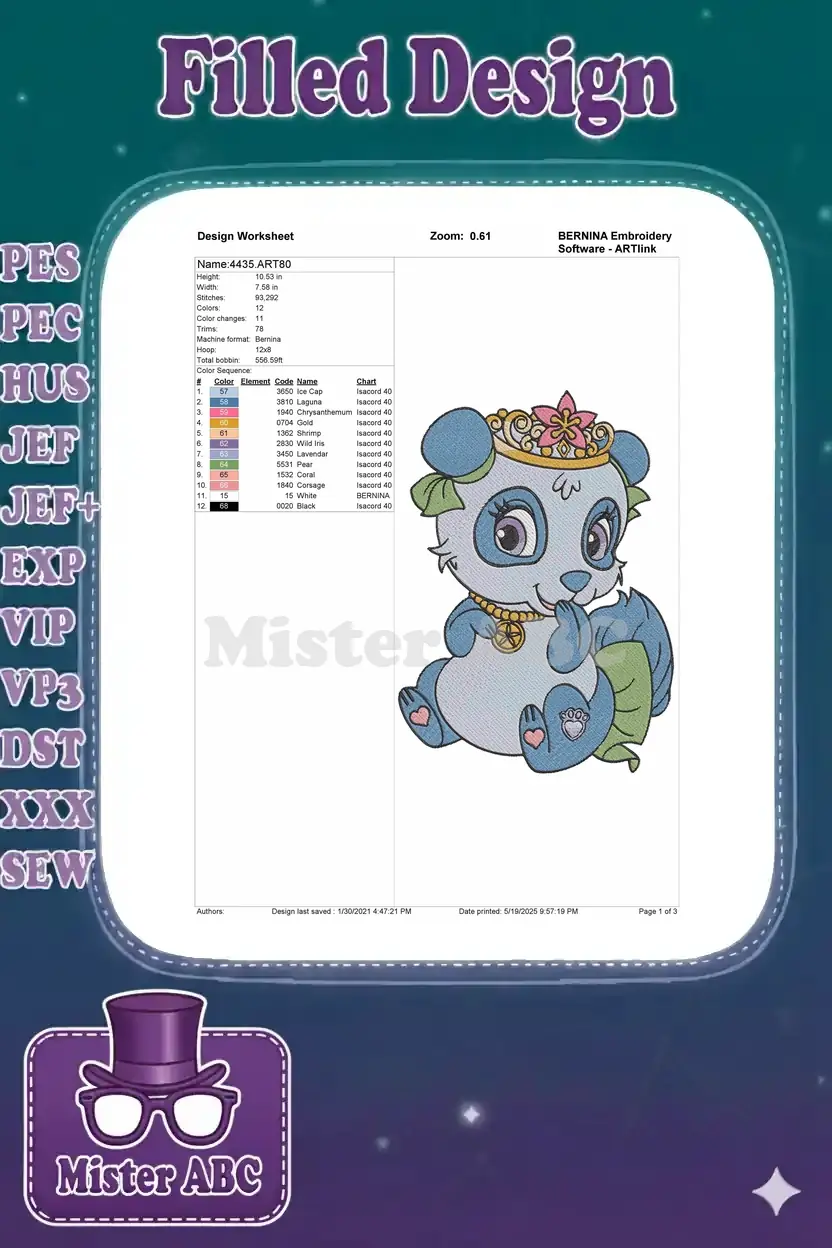 Enchanting blue panda princess with golden crown and medallion embroidery designs