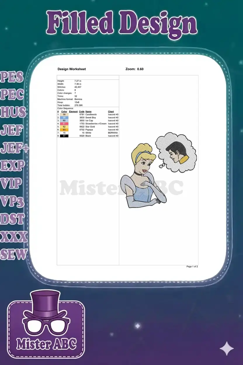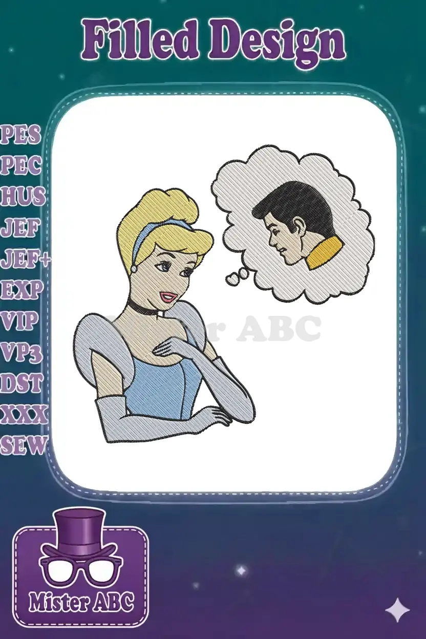Enchanting Cinderella embroidery design, dreaming of her Prince Charming. Perfect for fairytale projects, apparel, or decorative pieces.