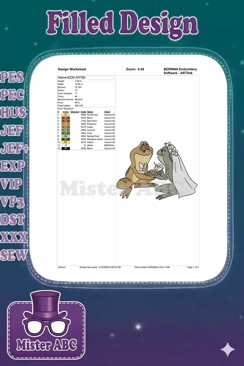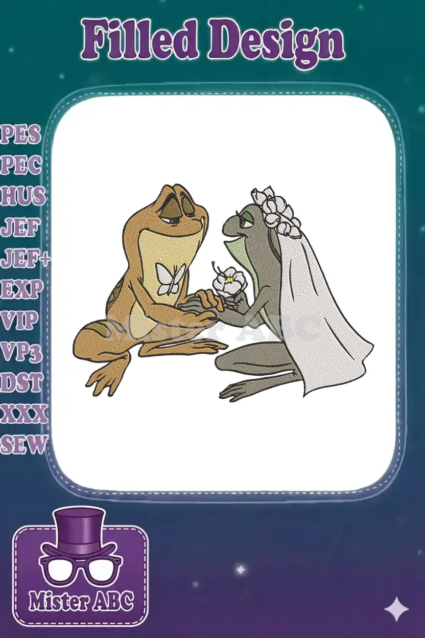 Celebrate love with this enchanting embroidery design featuring two adorable frogs in a whimsical wedding embrace. Perfect for romantic projects!