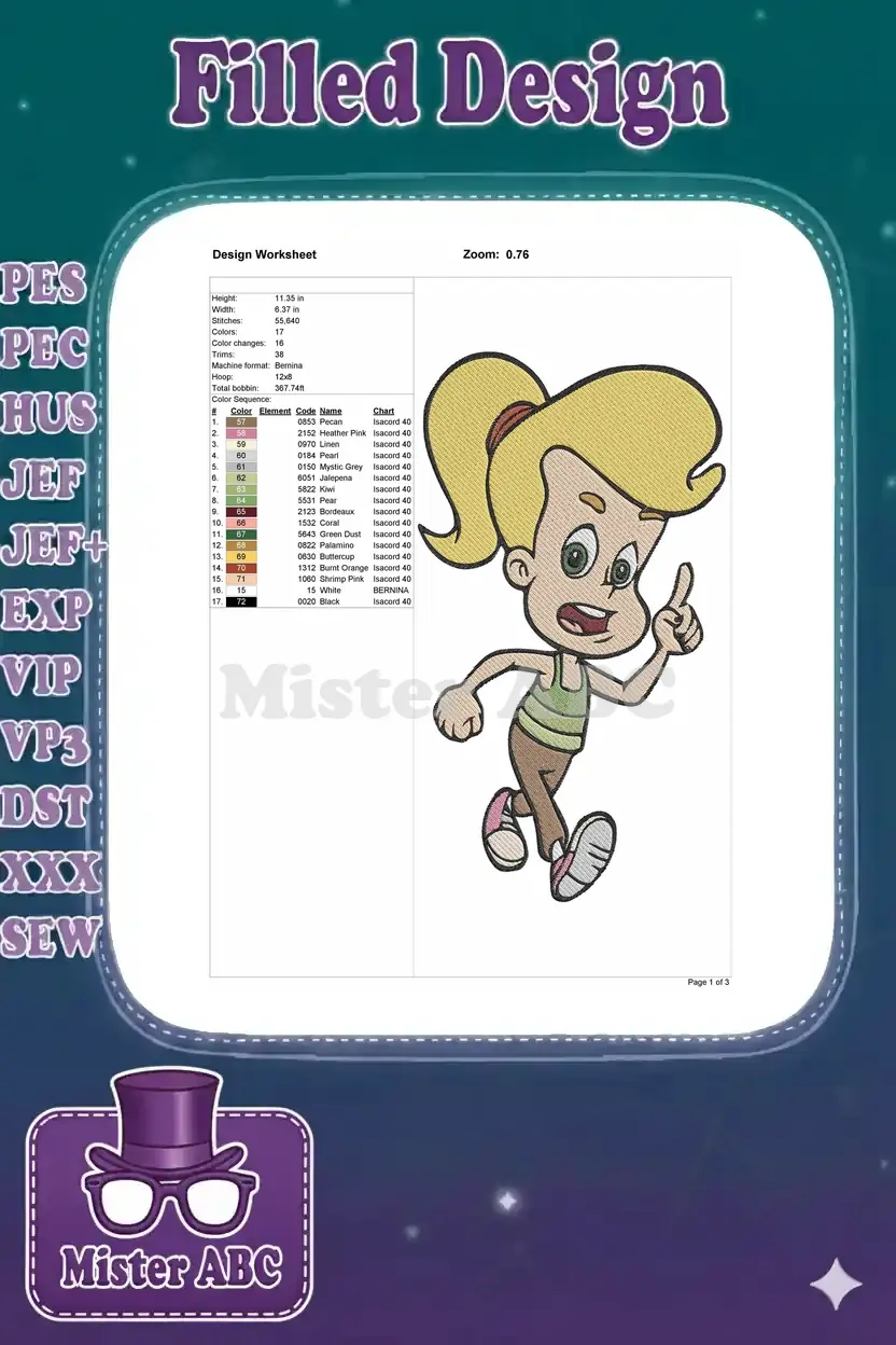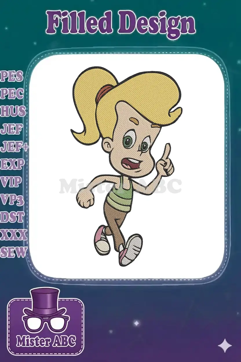 Energetic blonde cartoon girl running and pointing embroidery designs
