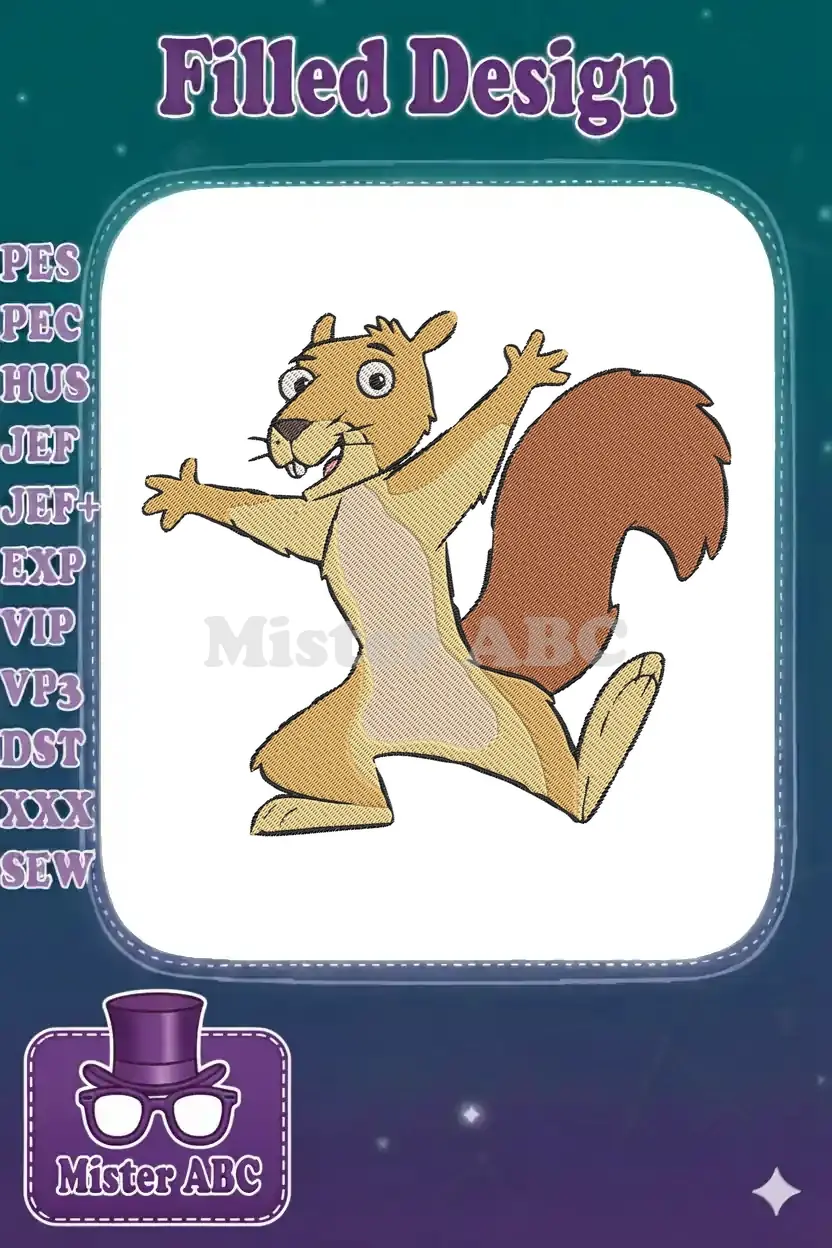 Energetic cartoon squirrel character running embroidery designs