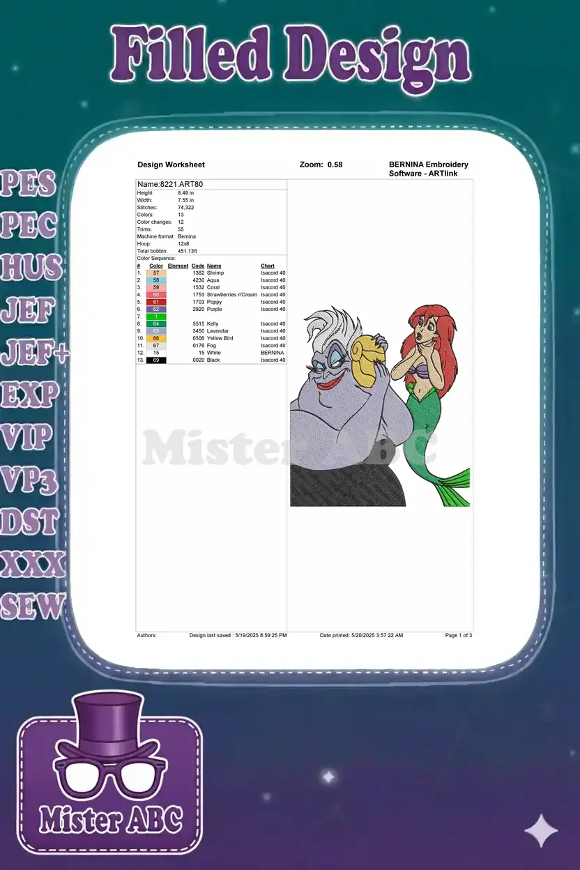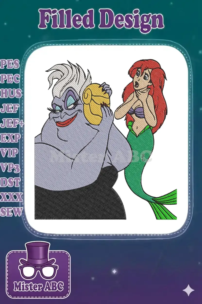Evil Ursula capturing Ariel’s voice in shell embroidery designs