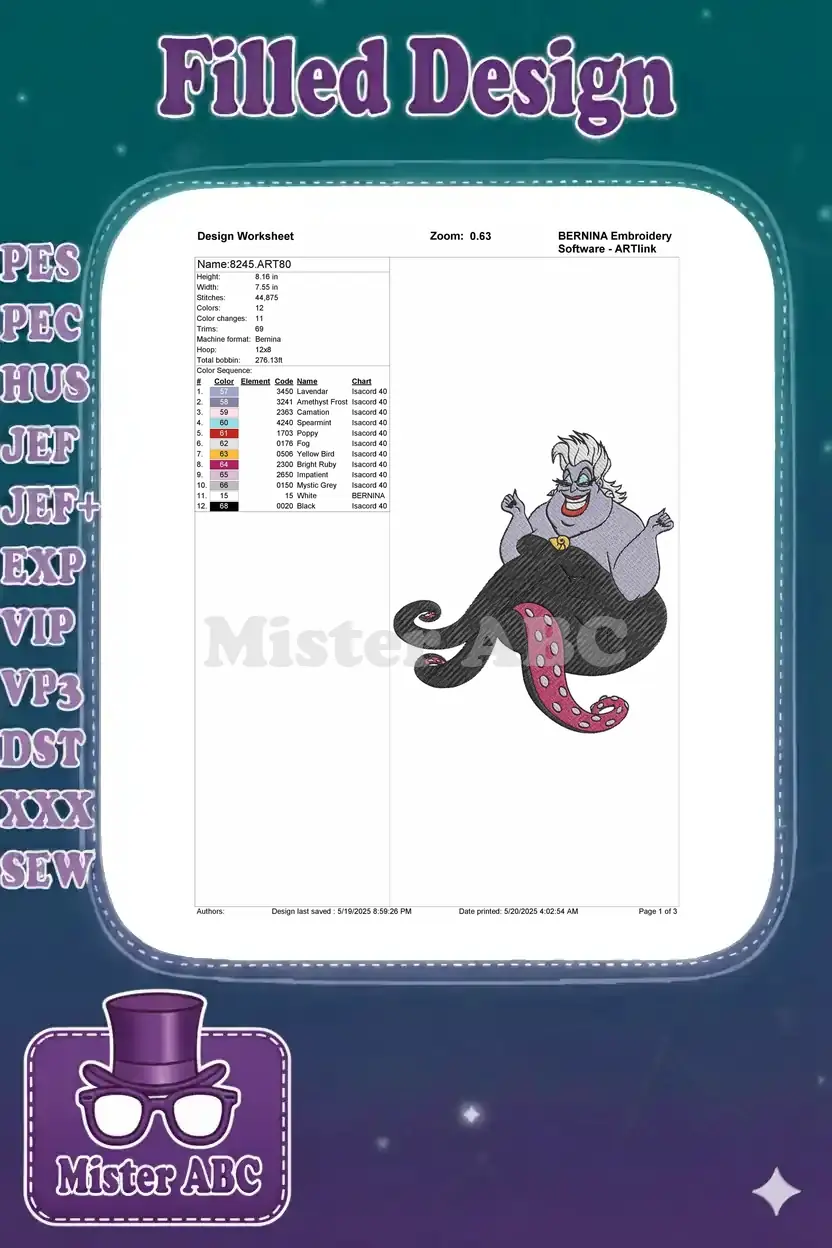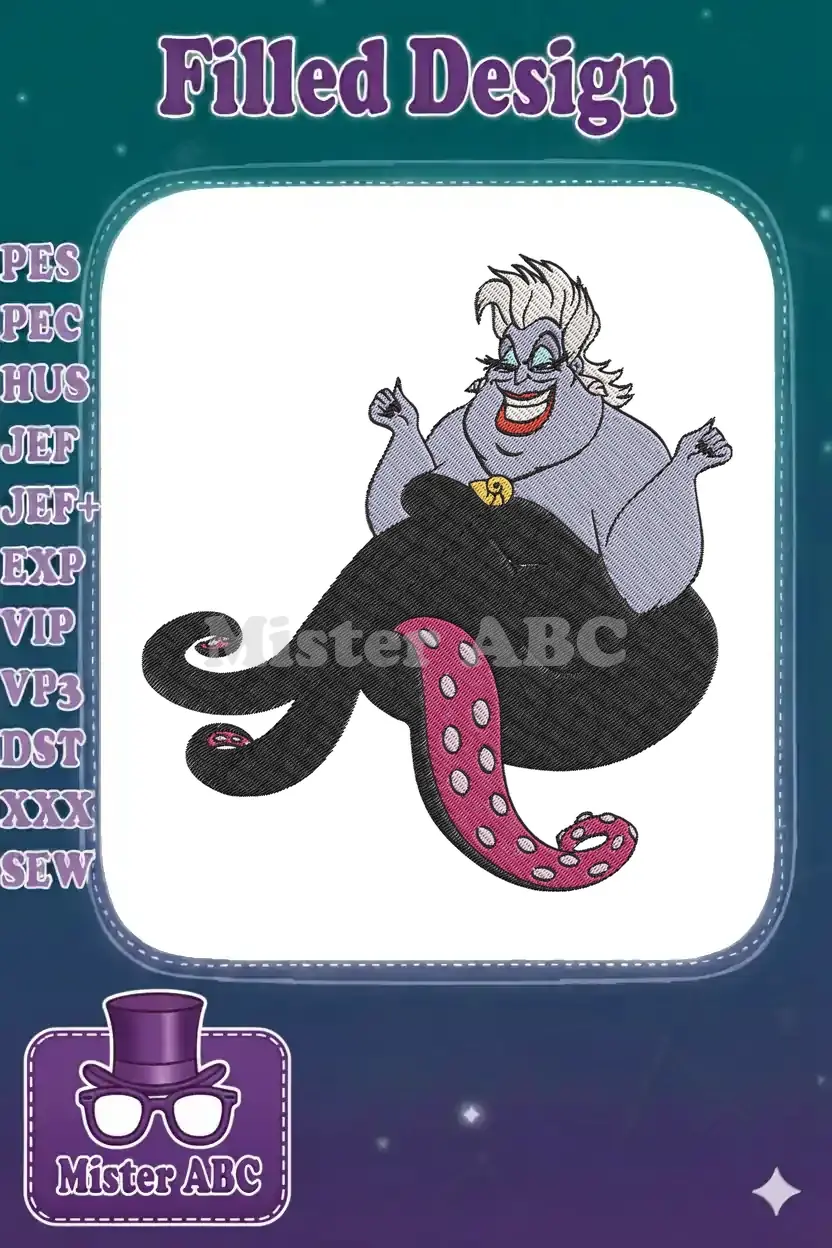 Unleash the iconic charm of Ursula with this detailed embroidery design. Perfect for fans of Disney villains and unique crafting.