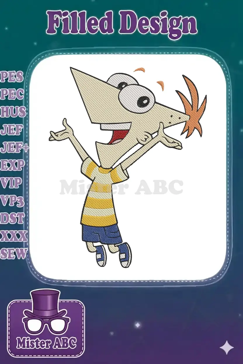 Excited Phineas Flynn cartoon character embroidery designs for fans