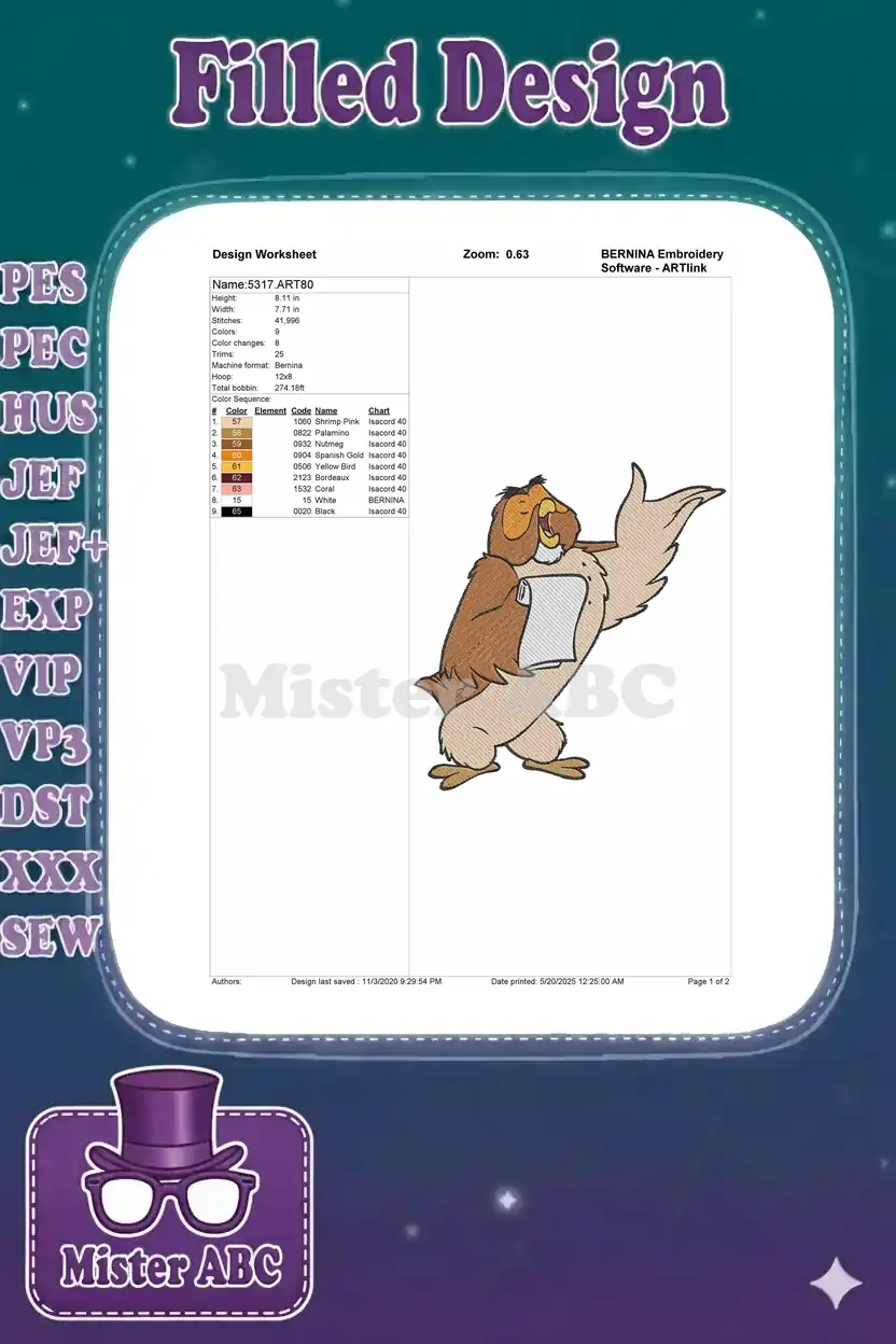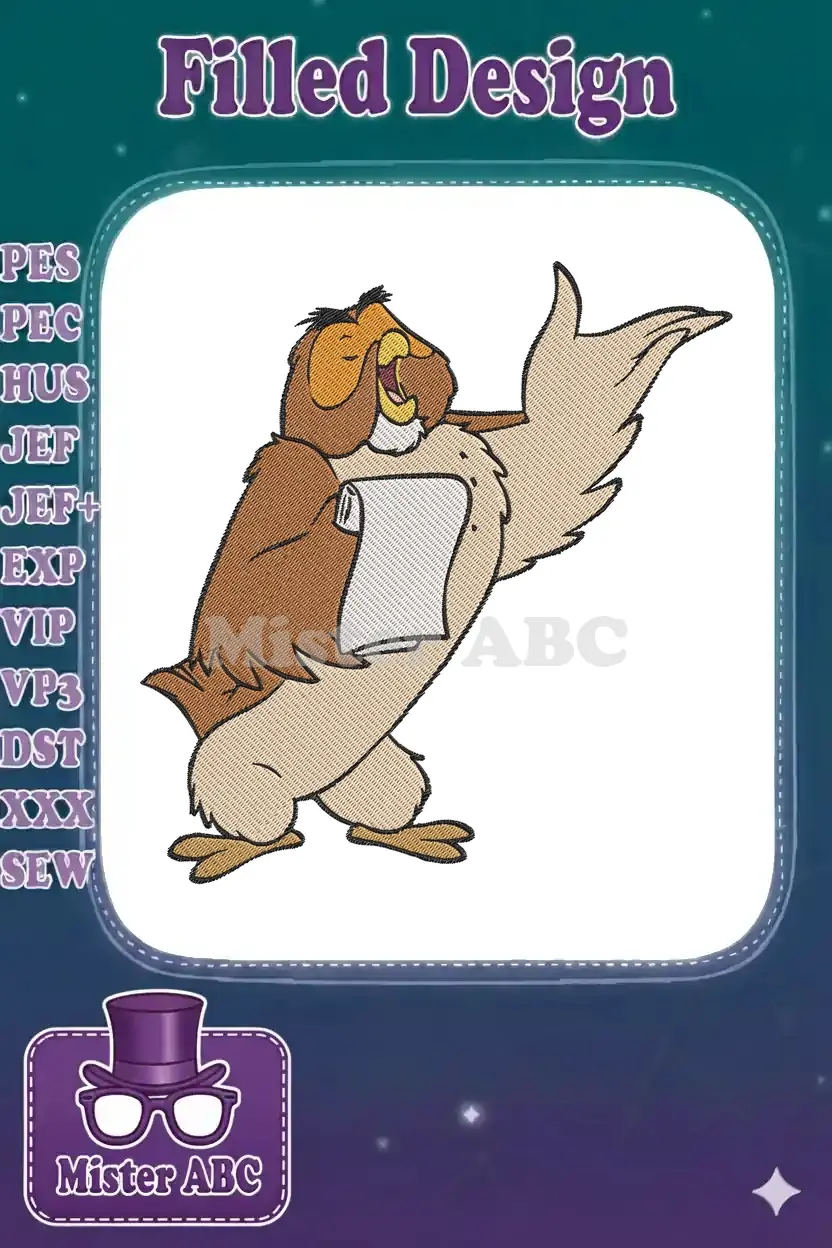 Expressive brown cartoon owl singing from scroll embroidery designs