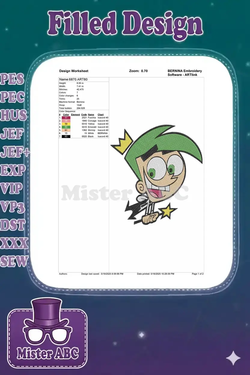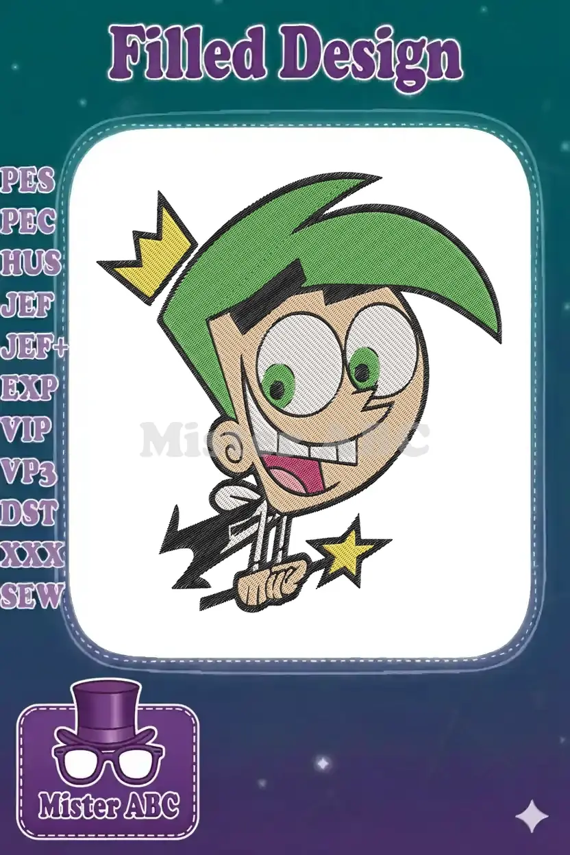 Fairly OddParents Cosmo green hair crown magic wand embroidery designs