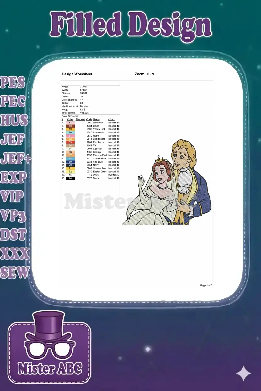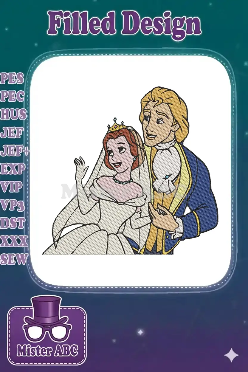 Celebrate true love with this enchanting embroidery design of Belle and Prince Adam on their wedding day.