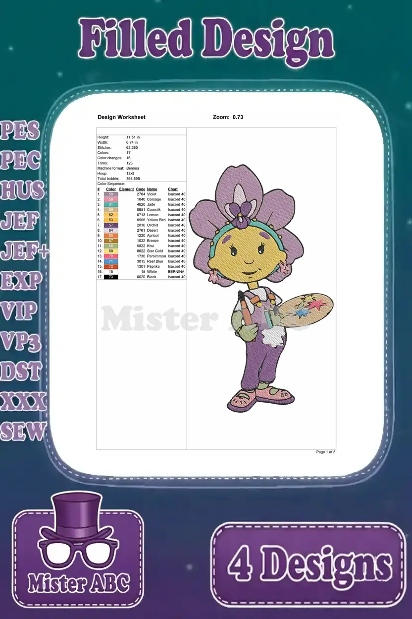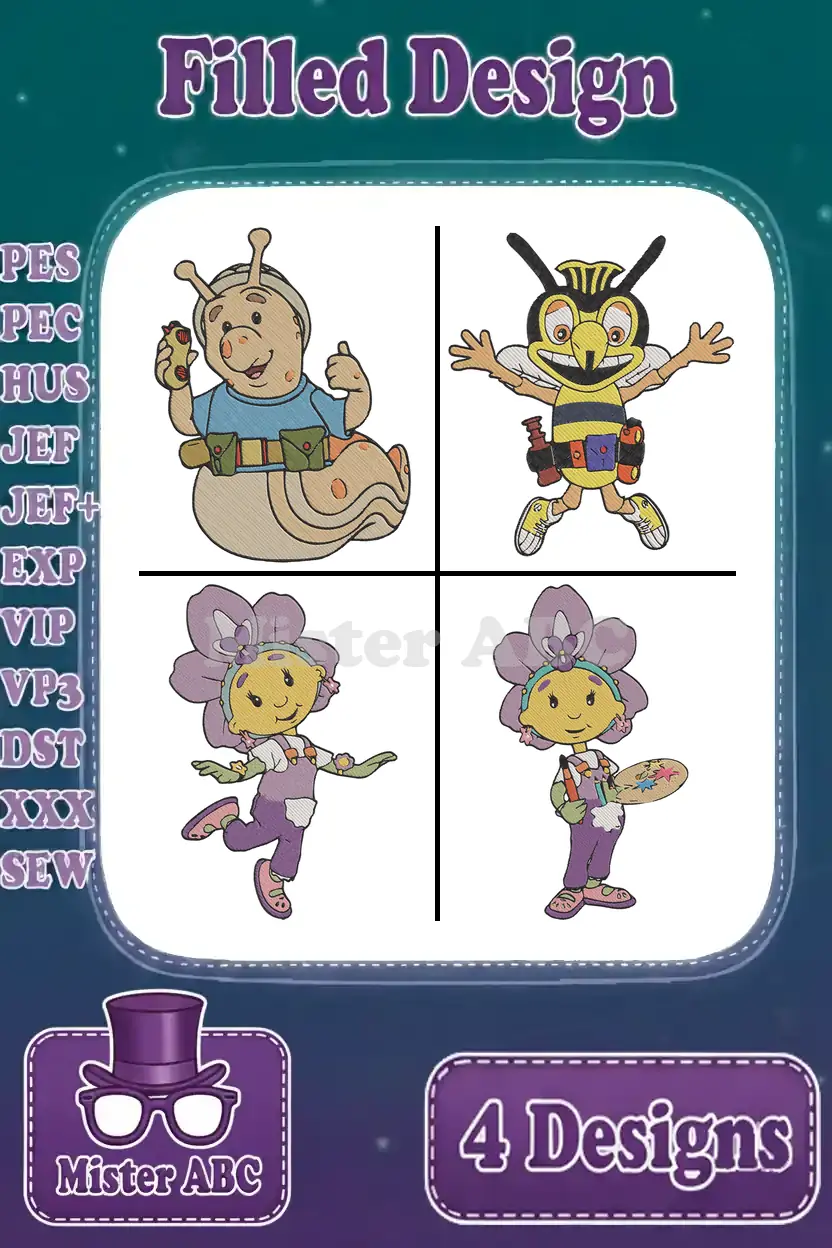 Discover a delightful bundle of four filled embroidery designs featuring charming cartoon characters. Perfect for adding a whimsical touch to any project!