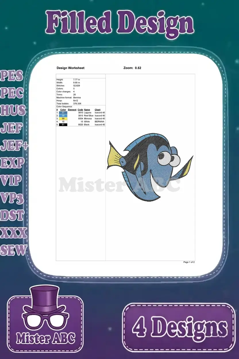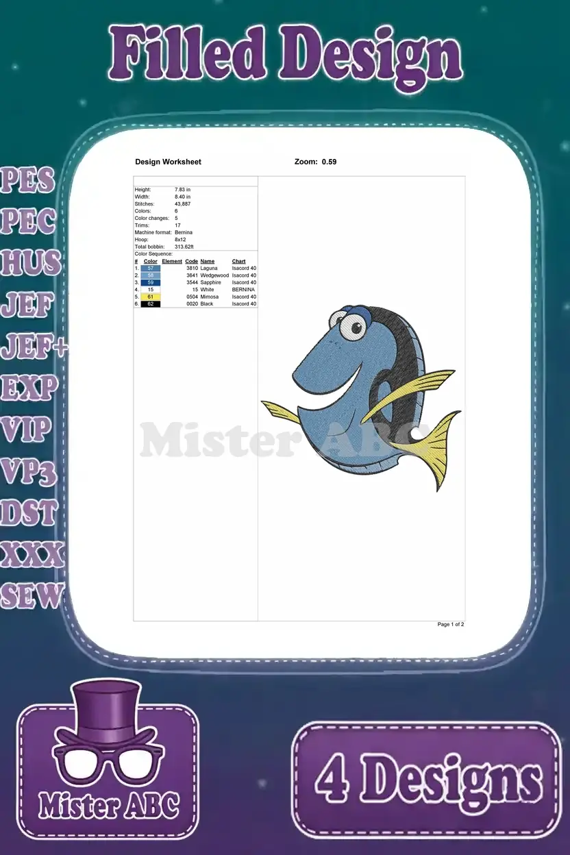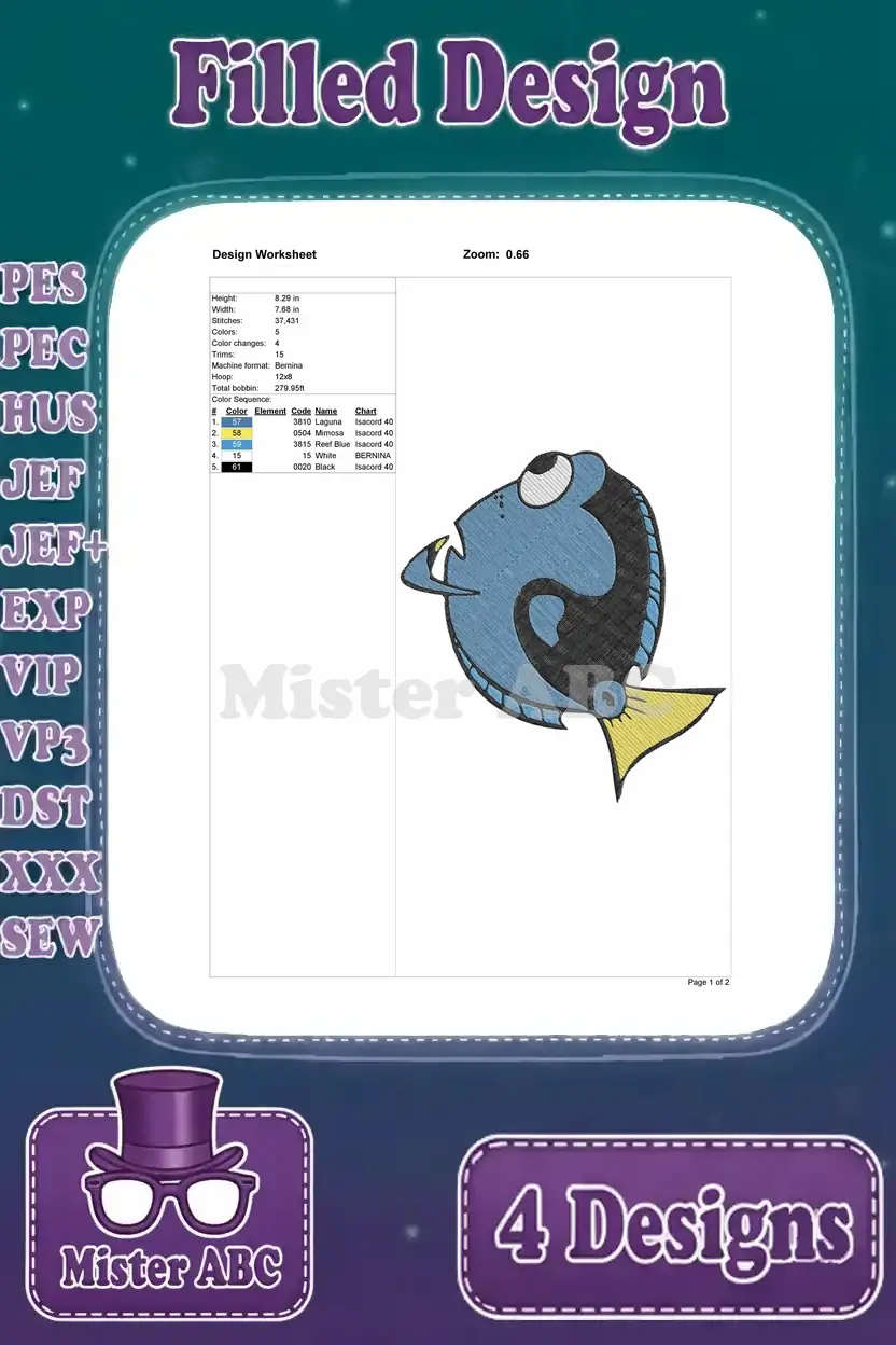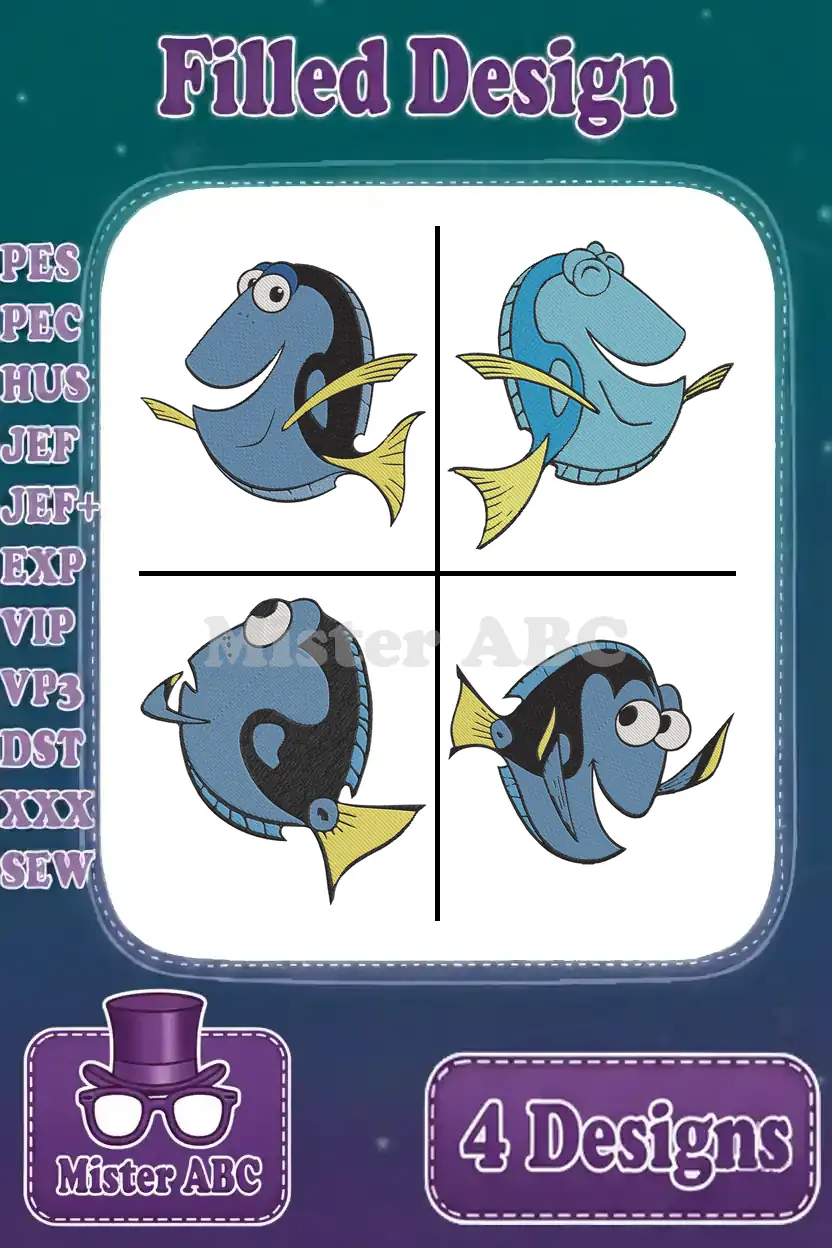 Finding Dory – Dory The Blue Tang Fish – Multiple Swimming Poses – Ocean Adventure – Filled Embroidery Design
