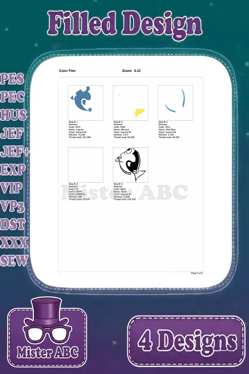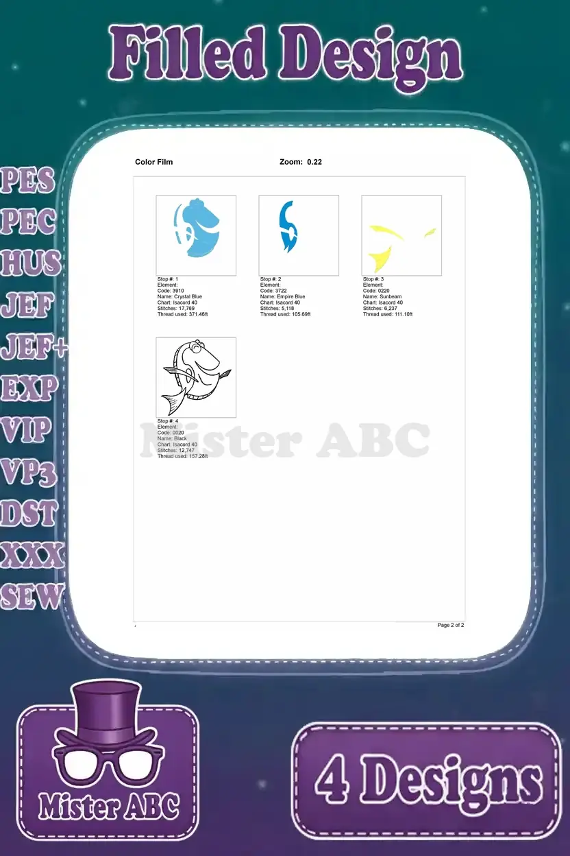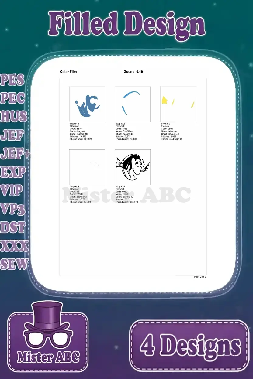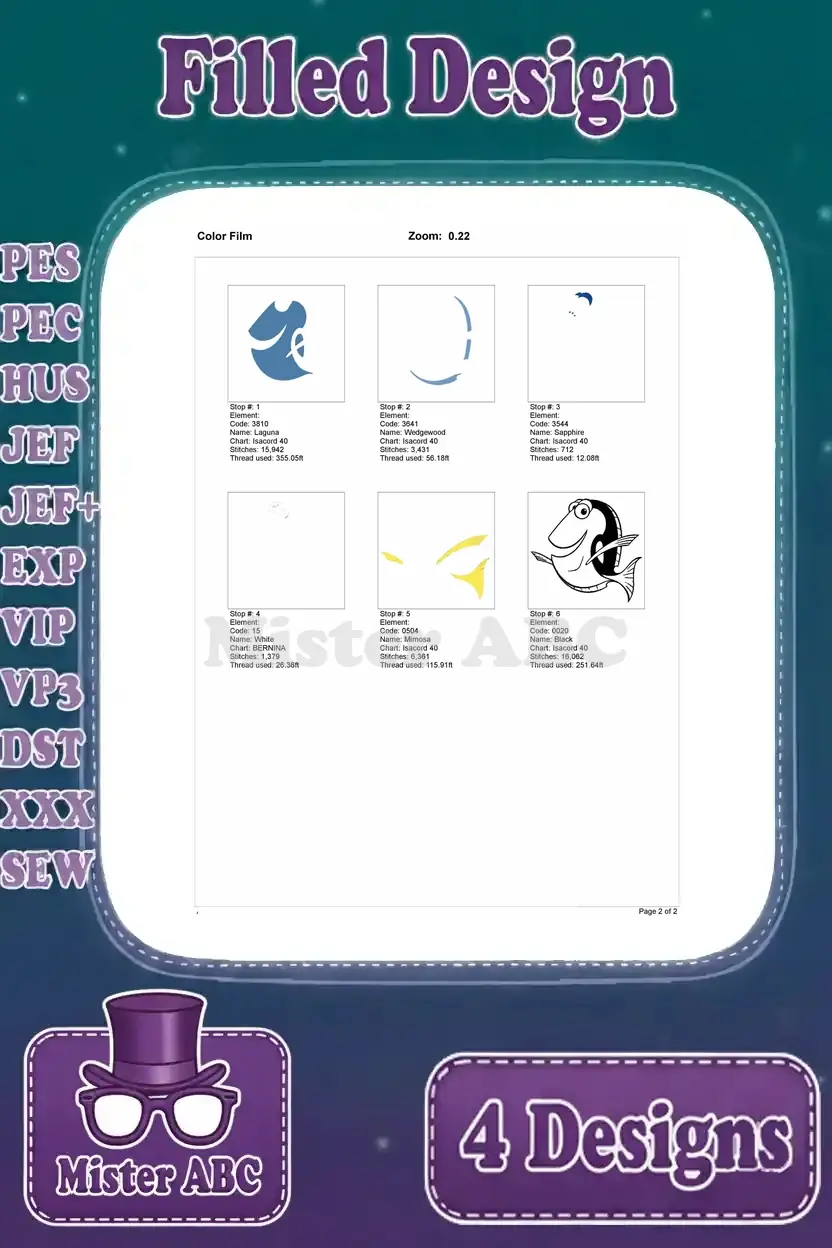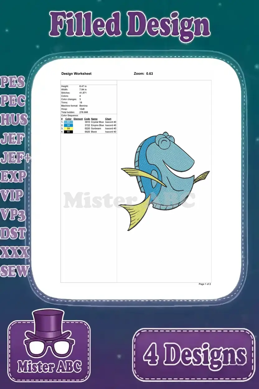 Finding Dory – Dory The Blue Tang Fish – Multiple Swimming Poses – Ocean Adventure – Filled Embroidery Design