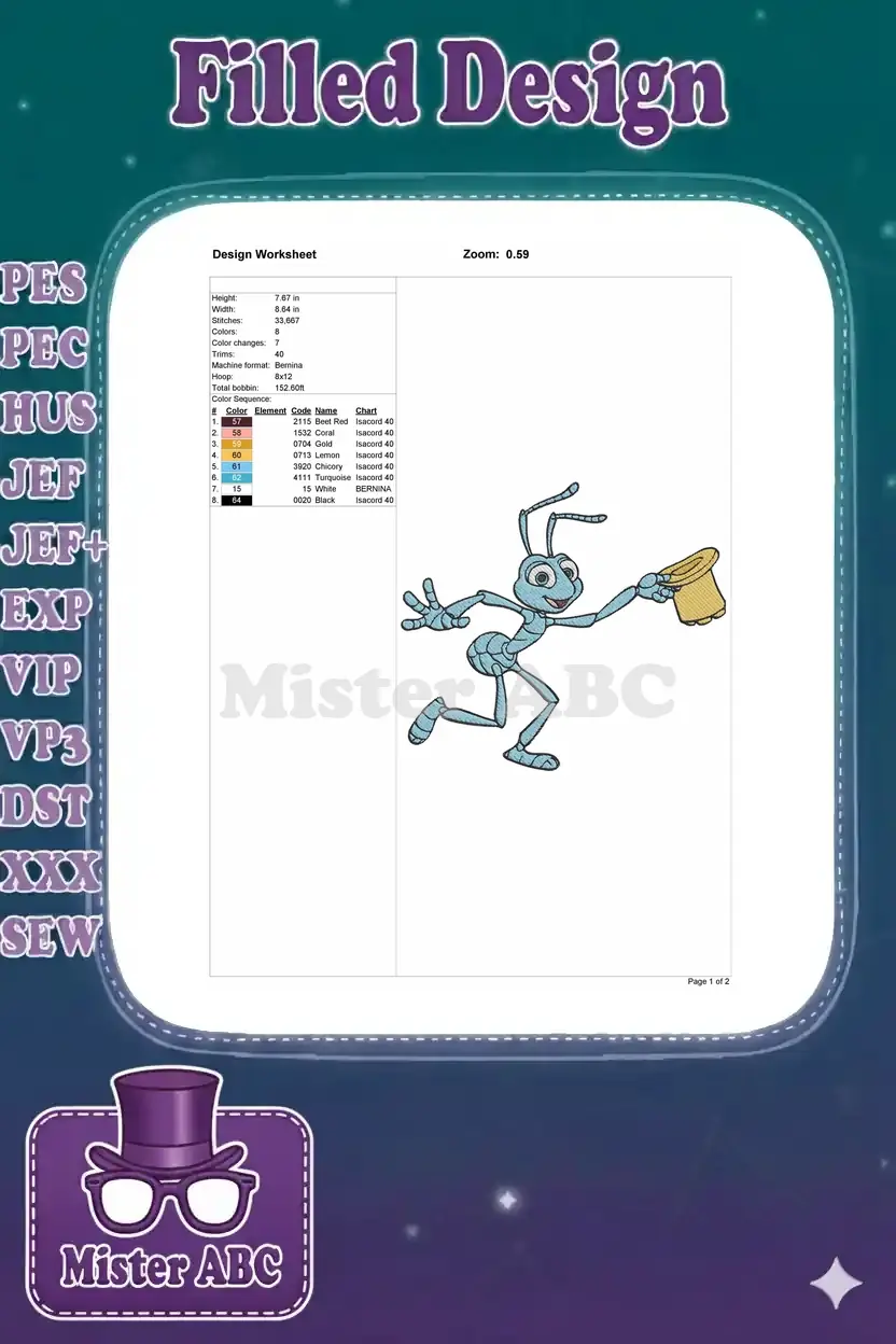 Flik the blue ant running with hat embroidery designs