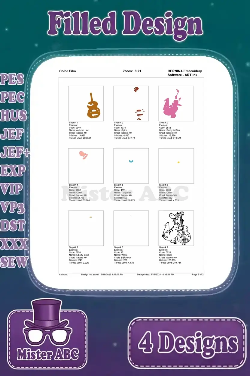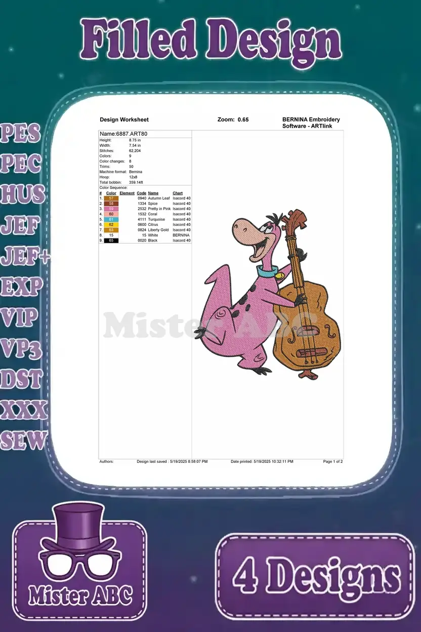 Flintstones Dino Pet Dinosaur Playing Bass Barney Rubble Caveman Friend Designs – Filled Embroidery Design