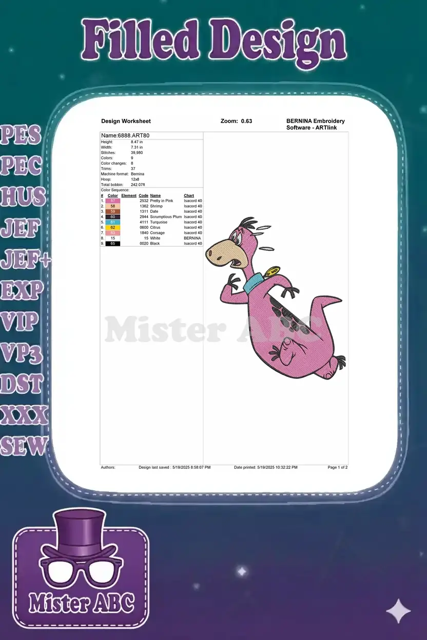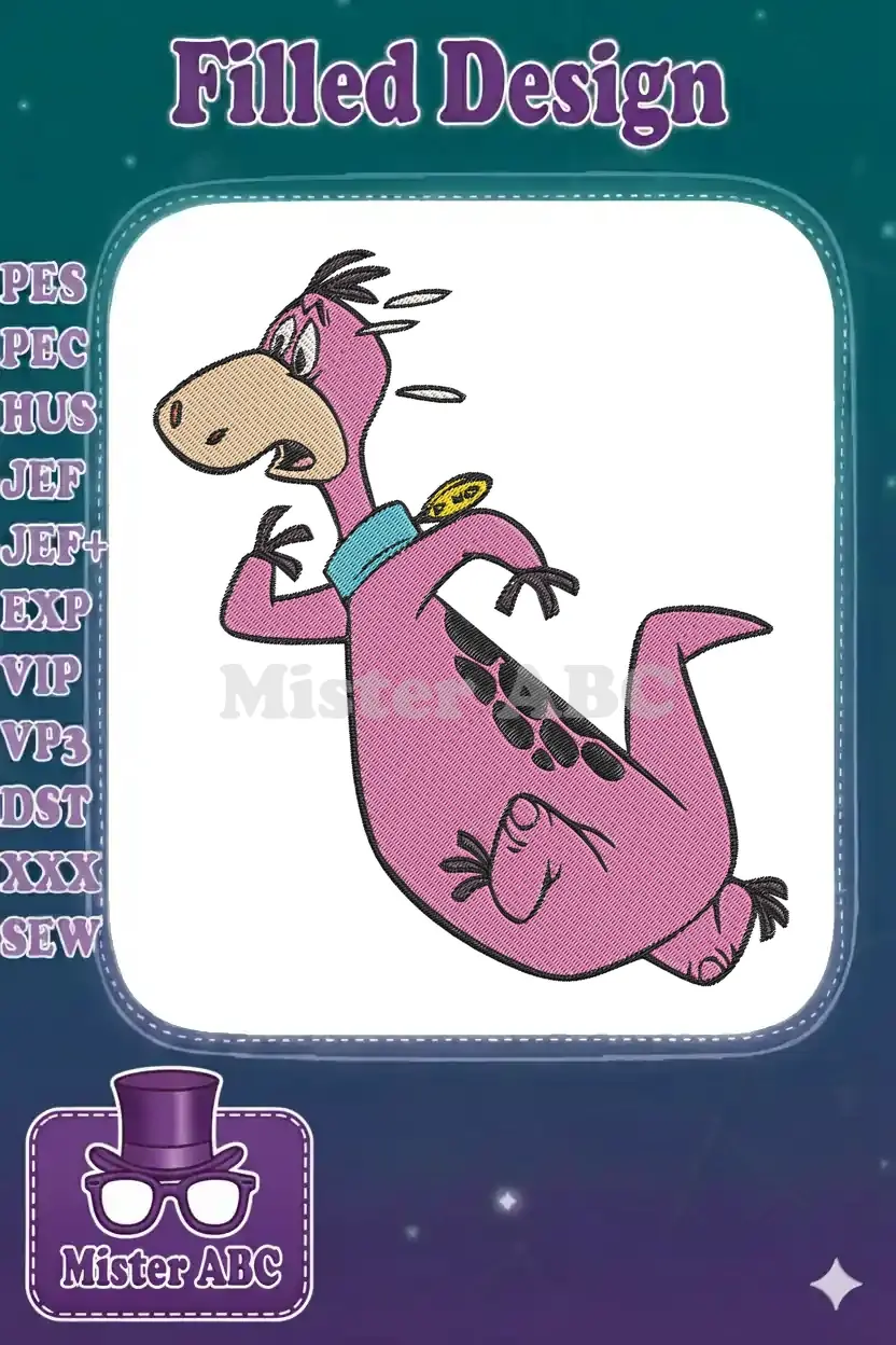Bring prehistoric fun to life with this vibrant embroidery design of Dino from The Flintstones, perfect for fans.