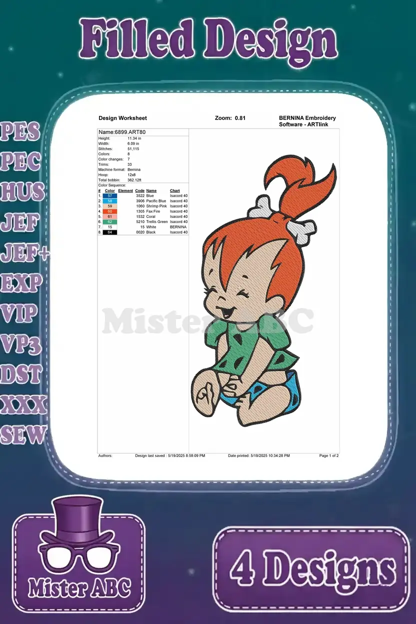 Flintstones Pebbles Bamm Bamm With Dino Playing Wagon Childhood Friends Set – Filled Embroidery Design