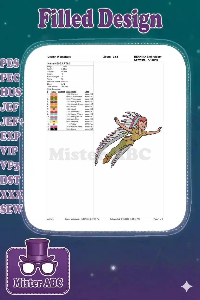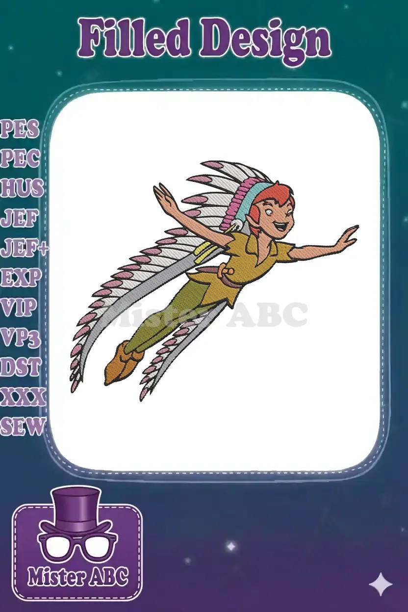 Embark on an adventure with this captivating Peter Pan embroidery design, soaring with a unique feathered headdress. Add a touch of magic!
